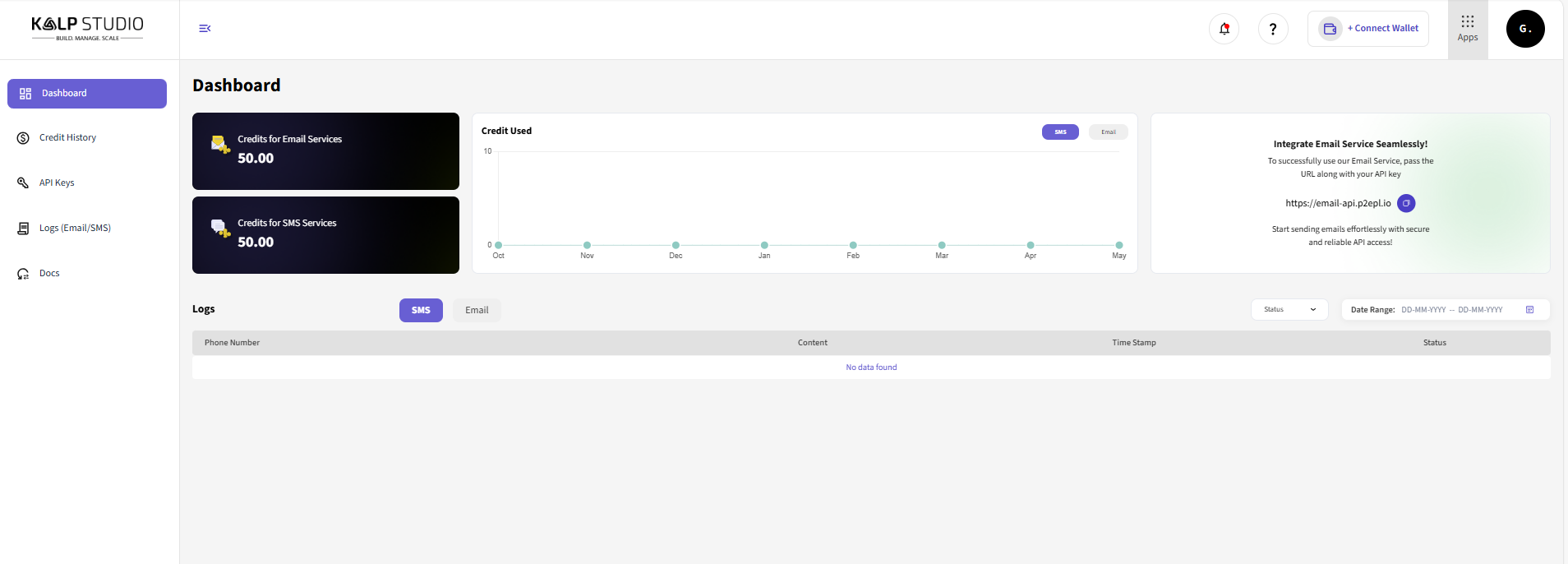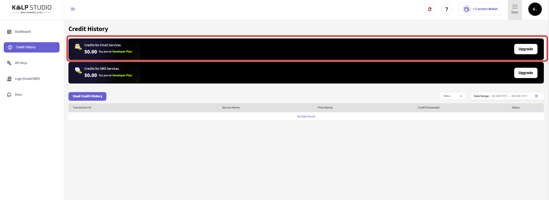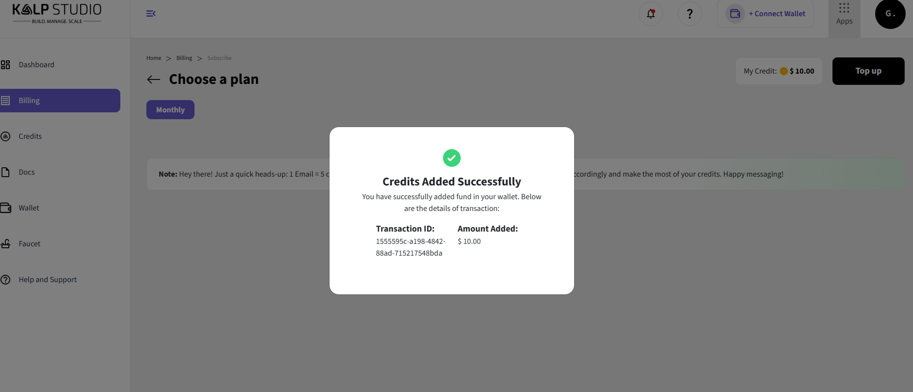1. Your Kalp Studio account's credit balance will be updated with the newly purchased credits. You can verify this by checking the "My Credits" display in the Billing section or by navigating to the "Dashboard" or "Credit History" page, where your "Credits for Email Services" should reflect the addition.