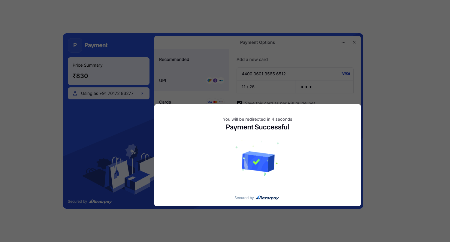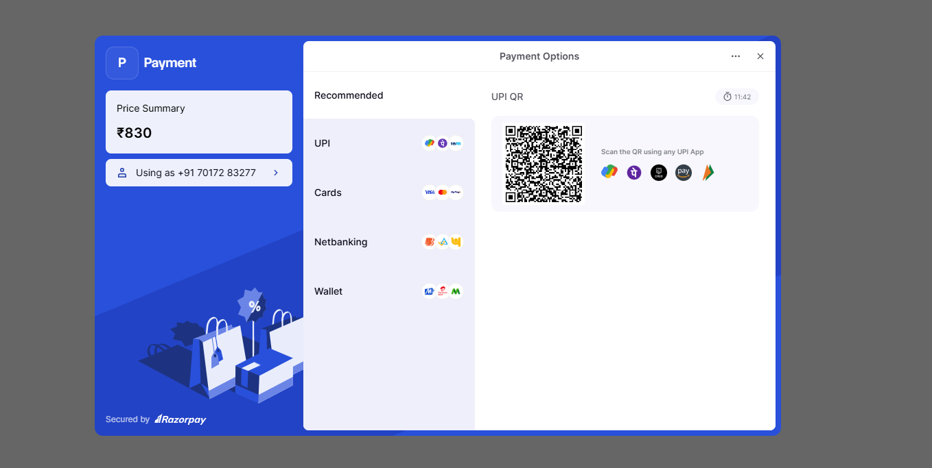 1. The Razorpay payment interface will load, displaying the transaction amount.