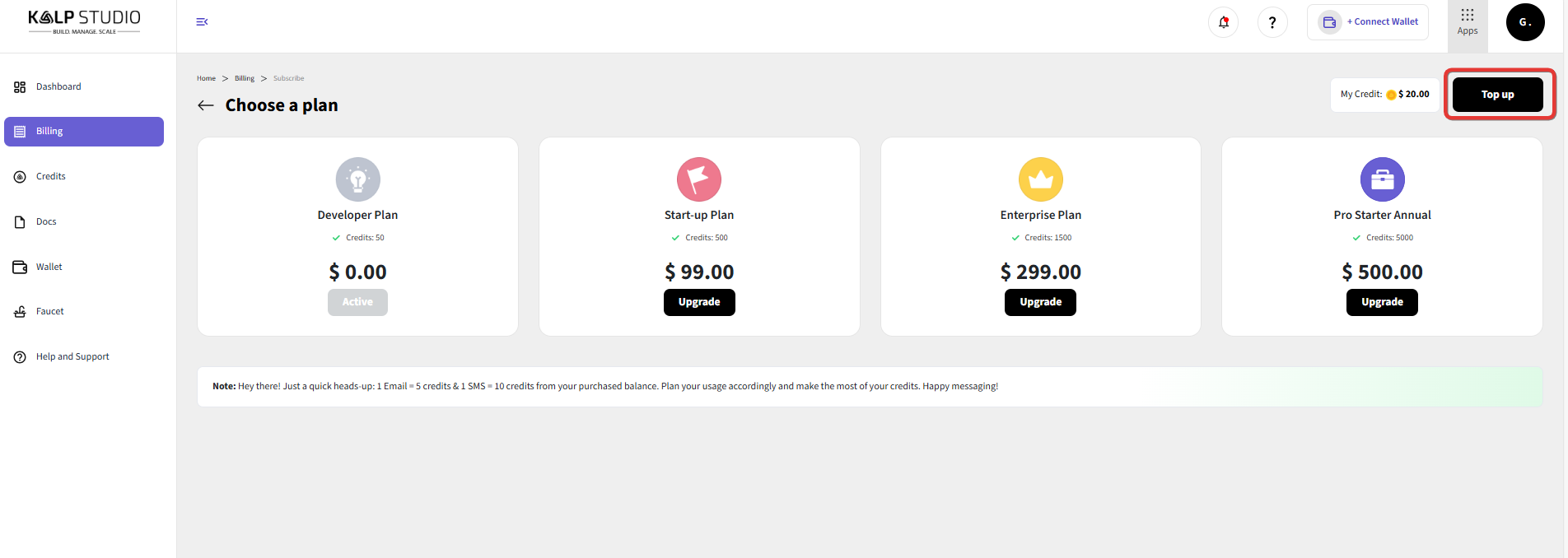 Adding credits for your email services in Kalp Studio is a simple and secure process. By following the steps outlined above, primarily using the "Top up" feature in the Billing section, you can quickly replenish your account balance. This ensures that your email marketing campaigns, transactional emails, and other communications can continue without interruption, allowing you to effectively reach your audience and manage your communication budget efficiently.