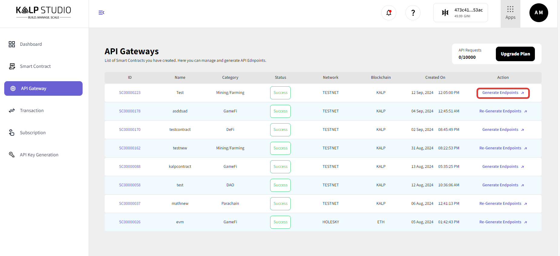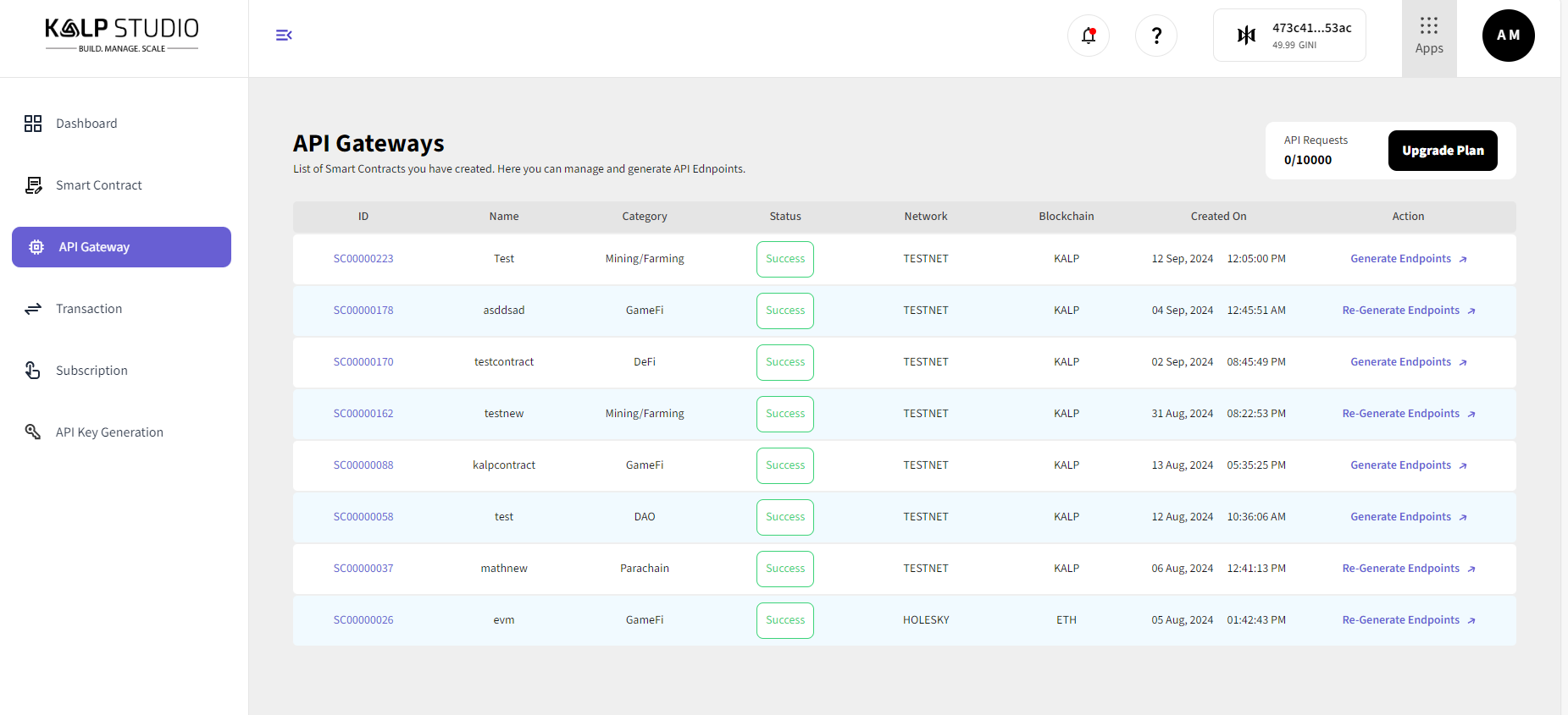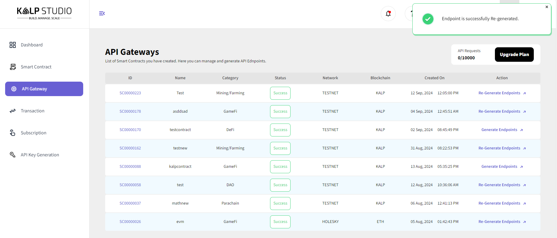 After generating the endpoints, you can view and manage them. The status of each endpoint (success or failure) will be displayed, along with details like the network and blockchain used.