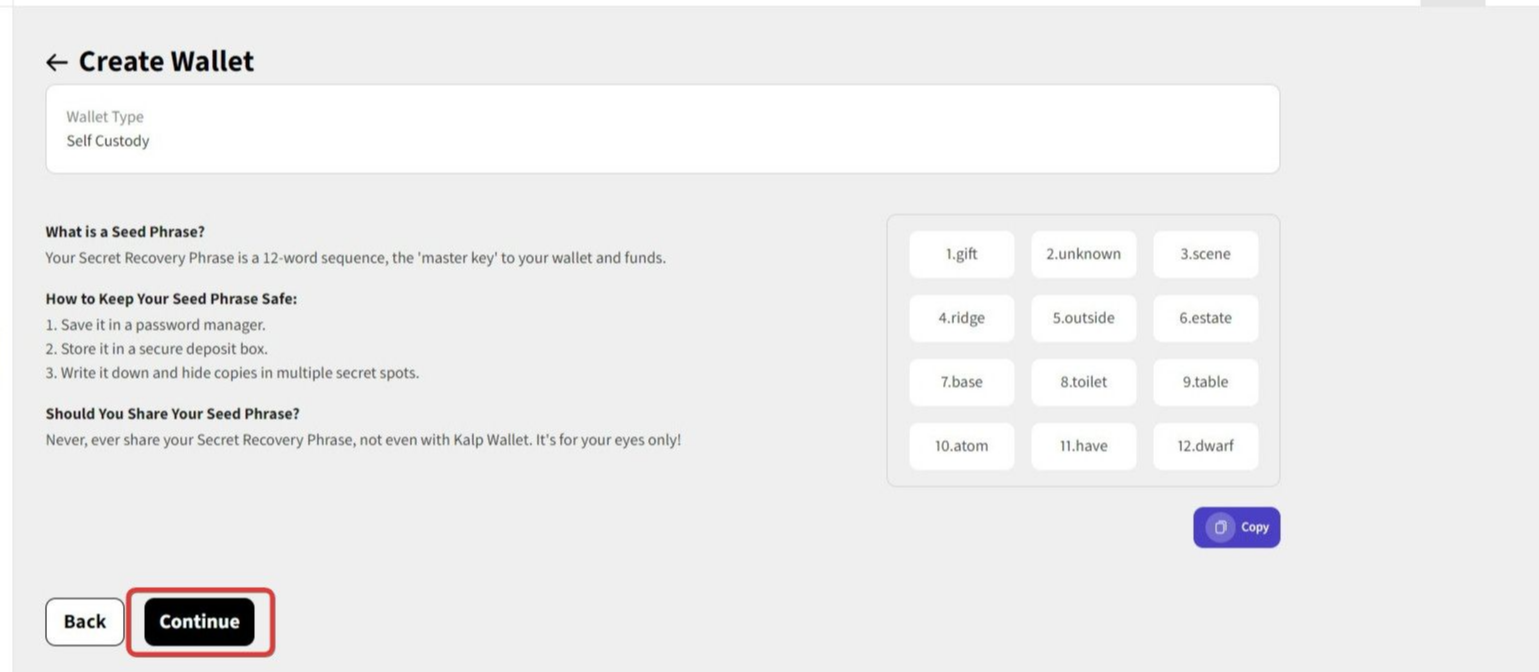 Self Custody Wallet: For this guide, we select 'Self Custody Wallet'. Click 'Continue' to proceed.