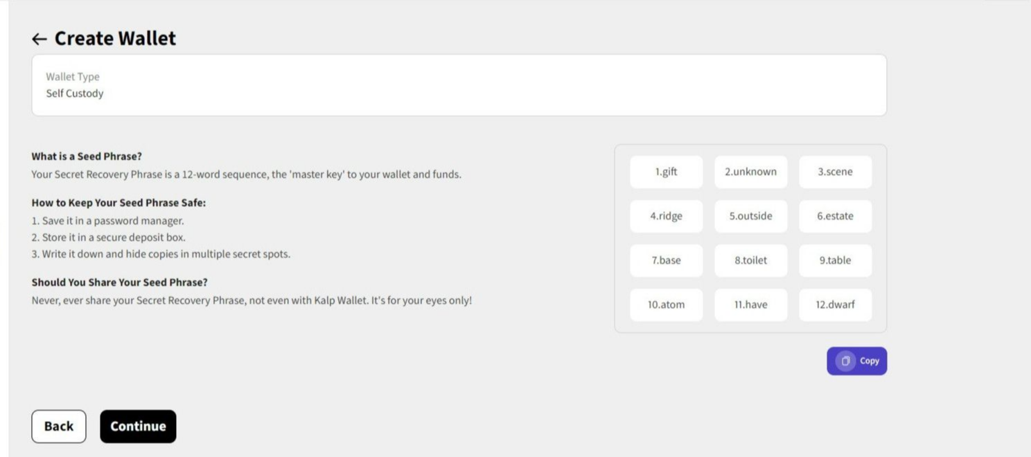 Secret Recovery Phrase: You will be provided with a 15-word seed phrase. This phrase is crucial for the security and recovery of your wallet.