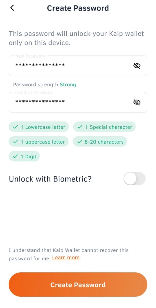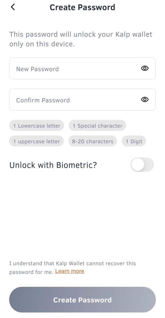 • Password Setup: On the next screen, you'll be prompted to create a password that will unlock your wallet on your device.