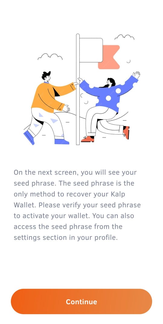 • Proceed to Seed Phrase: Tap "Continue" to move to the next screen where your seed phrase will be displayed.