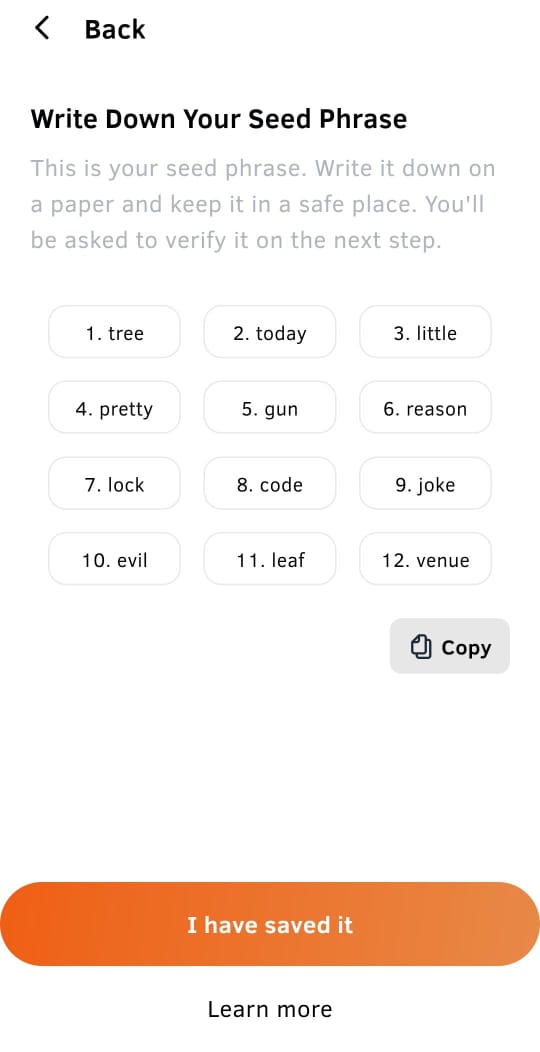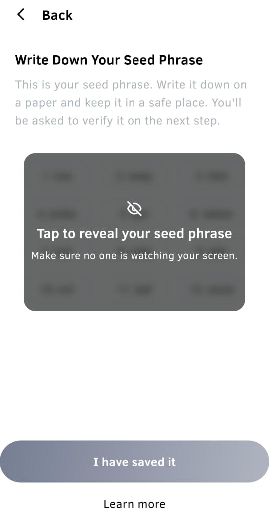 • Confirmation: After you've written down the seed phrase, tap "I have saved it" to continue.