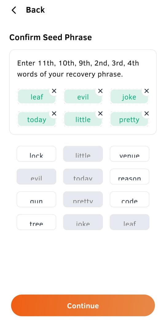 • Seed Phrase Verification: The app will now ask you to confirm your seed phrase by entering specific words from the sequence in the correct order.