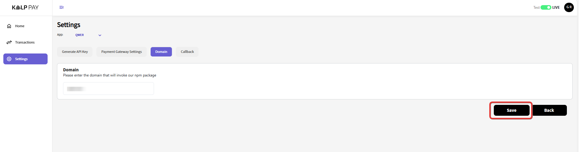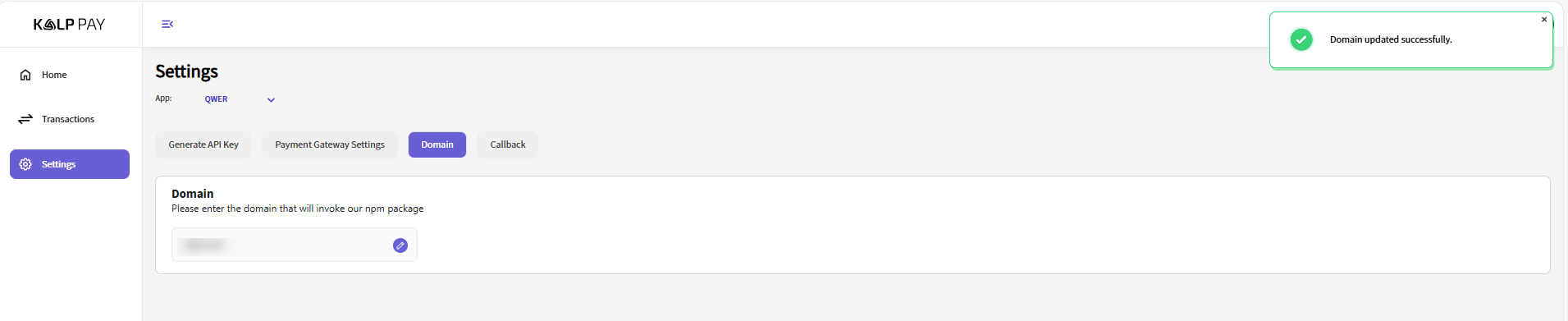 After entering your domain, confirm your changes. Ensure that the domain is correctly saved and displayed in the settings. This domain will now be associated with your app on KS Pay.