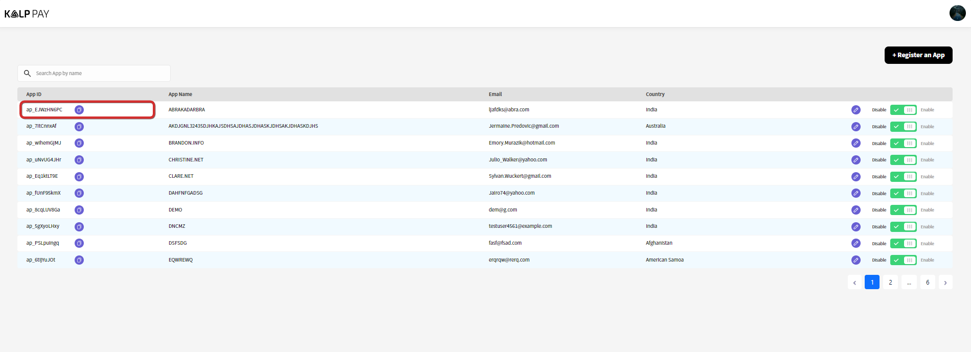 On the main dashboard, you'll see a list of all registered apps with details such as App ID, App Name, Email, and Country.