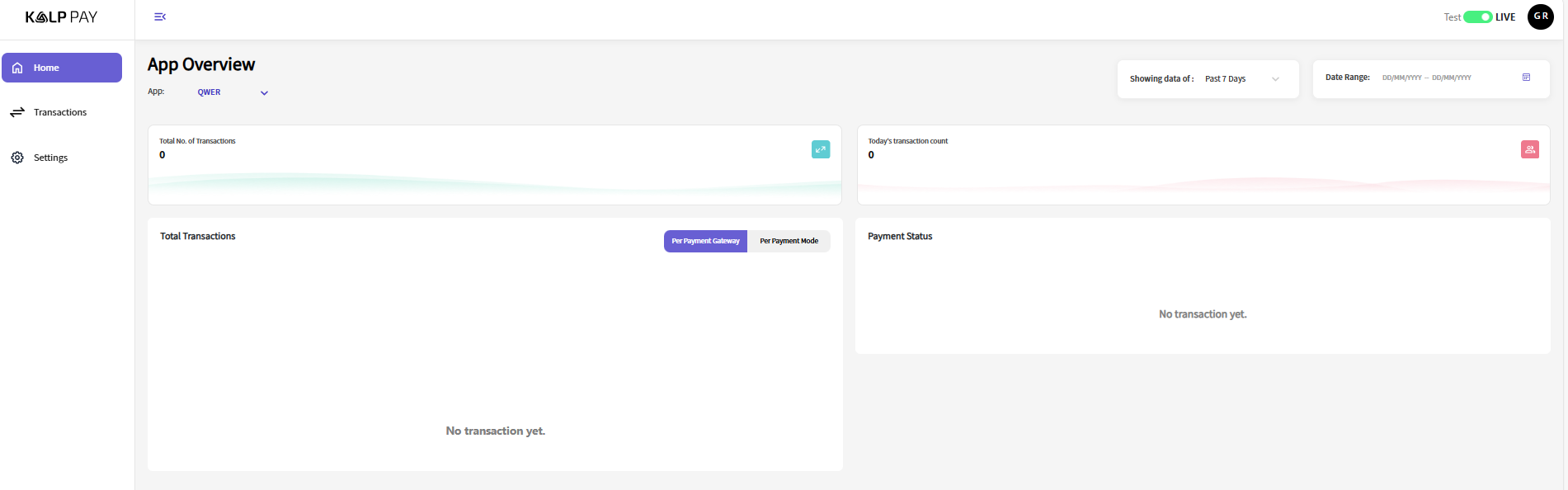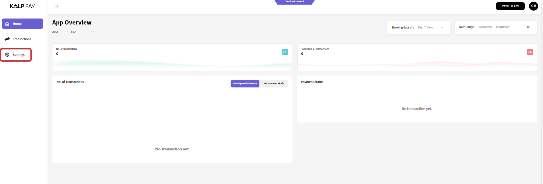 App Overview page displays metrics such as the number of transactions, payment status along with some filters.