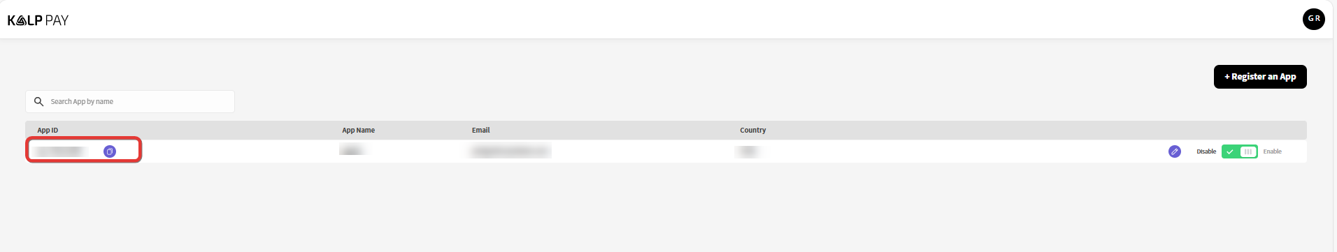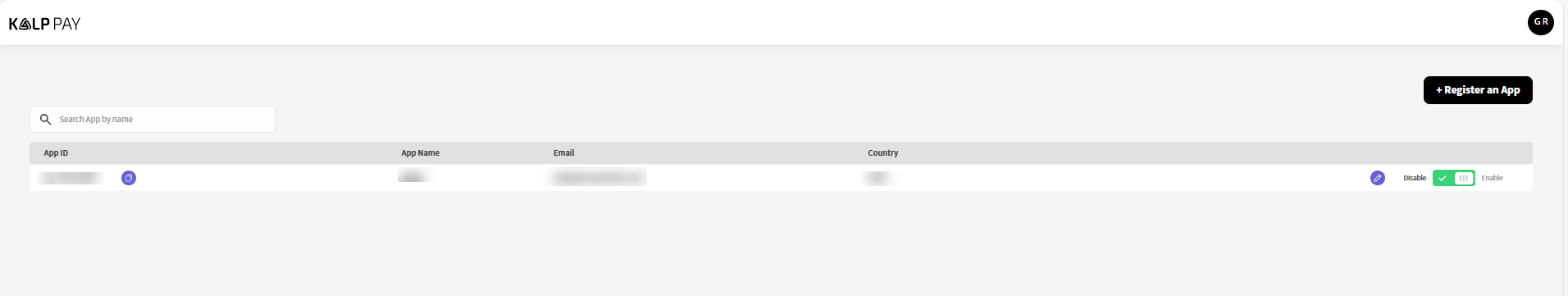 On the main dashboard, locate the list of registered apps. Each app has a unique ID, name, associated email, and country details.
