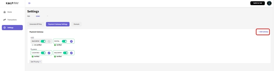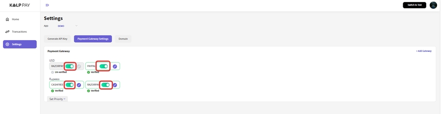 Use the toggle switch next to each gateway to enable or disable it. Enabled gateways will be active for transactions.