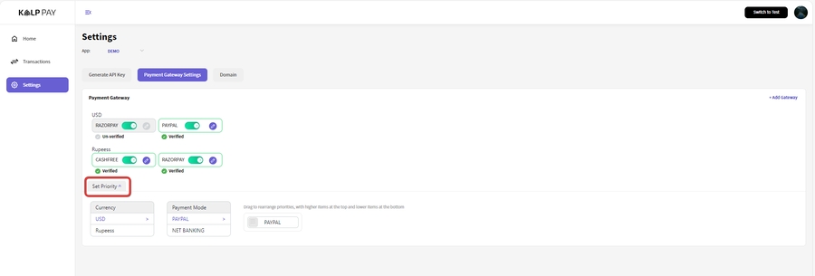 Place your preferred gateway (e.g., Razorpay or Cashfree) at the top of the list.