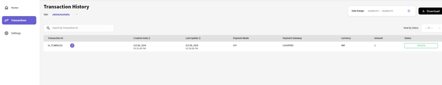1. In the Transaction History section, you’ll see a list of transactions with details such as Transaction ID, Creation Date, Last Update, Payment Mode, Payment Gateway, Currency, Amount, and Status.