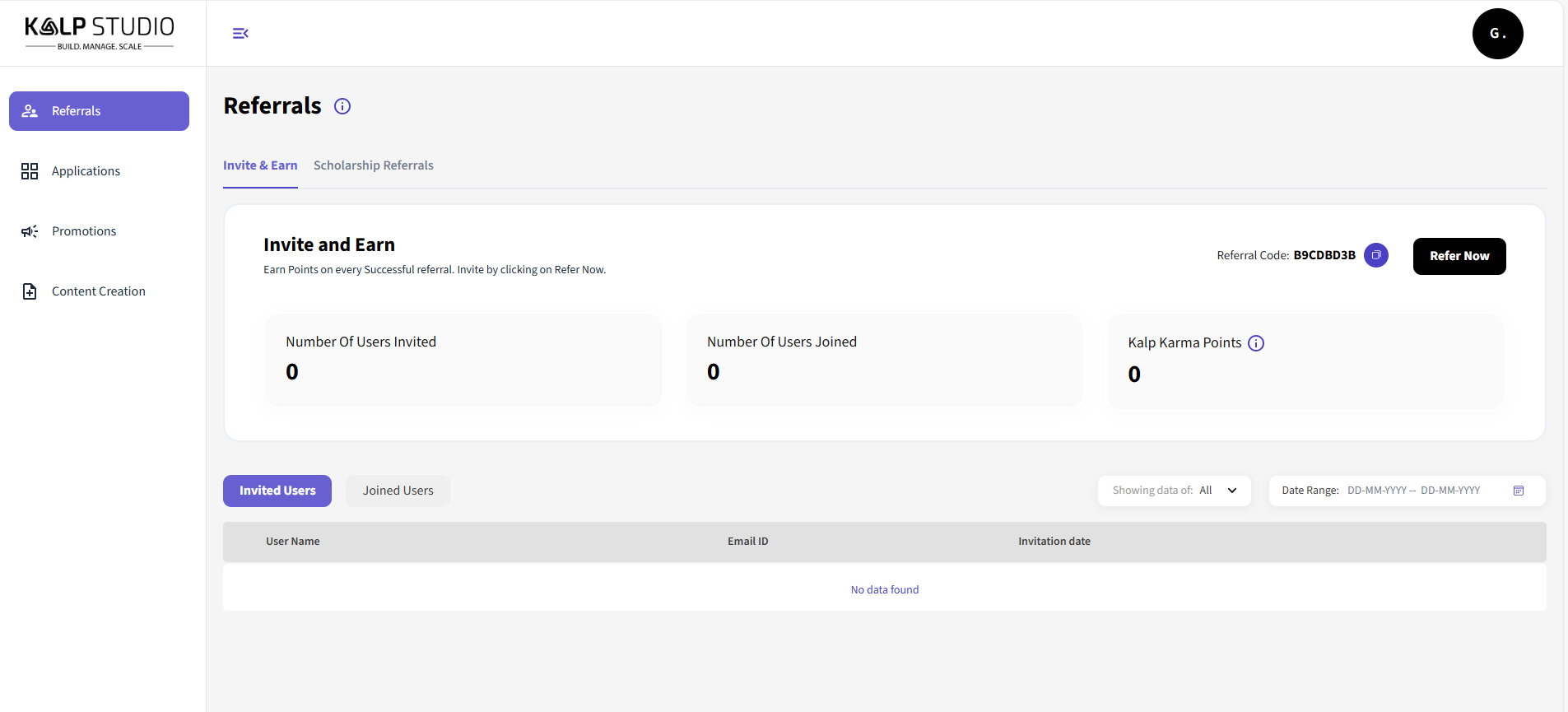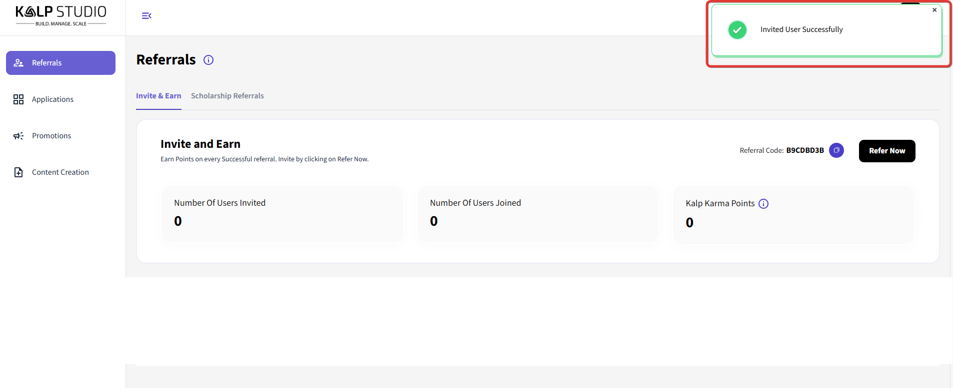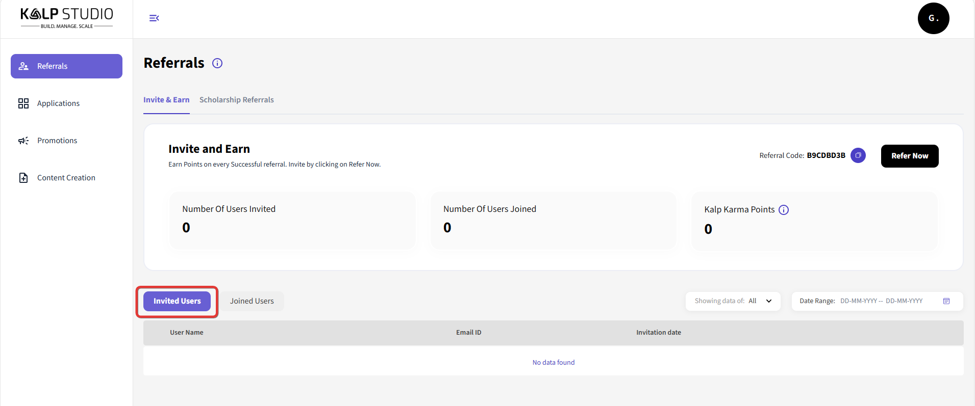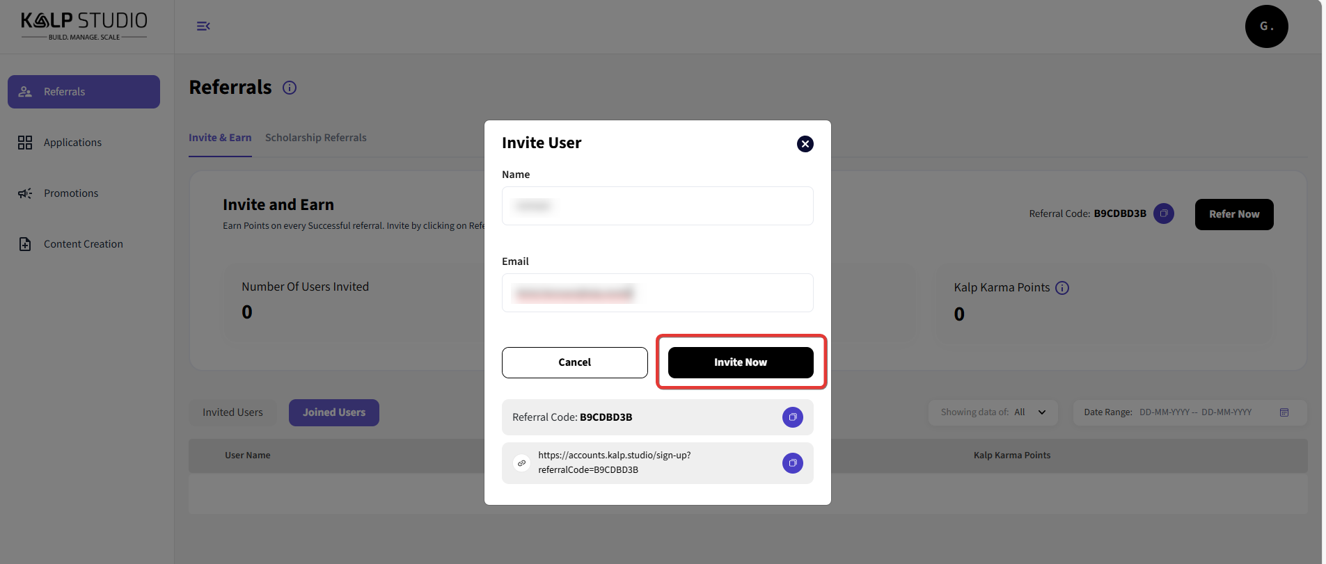Number Of Users Invited: This displays the number of users you have invited to join Kalp Studio through your referral program.