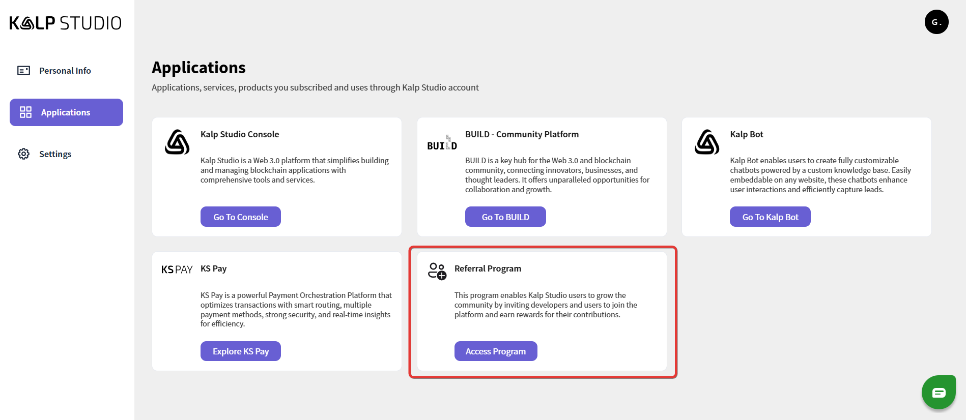 Locate the "Referral Program" Card: Scroll through the Applications section to find the card labeled "Referral Program."