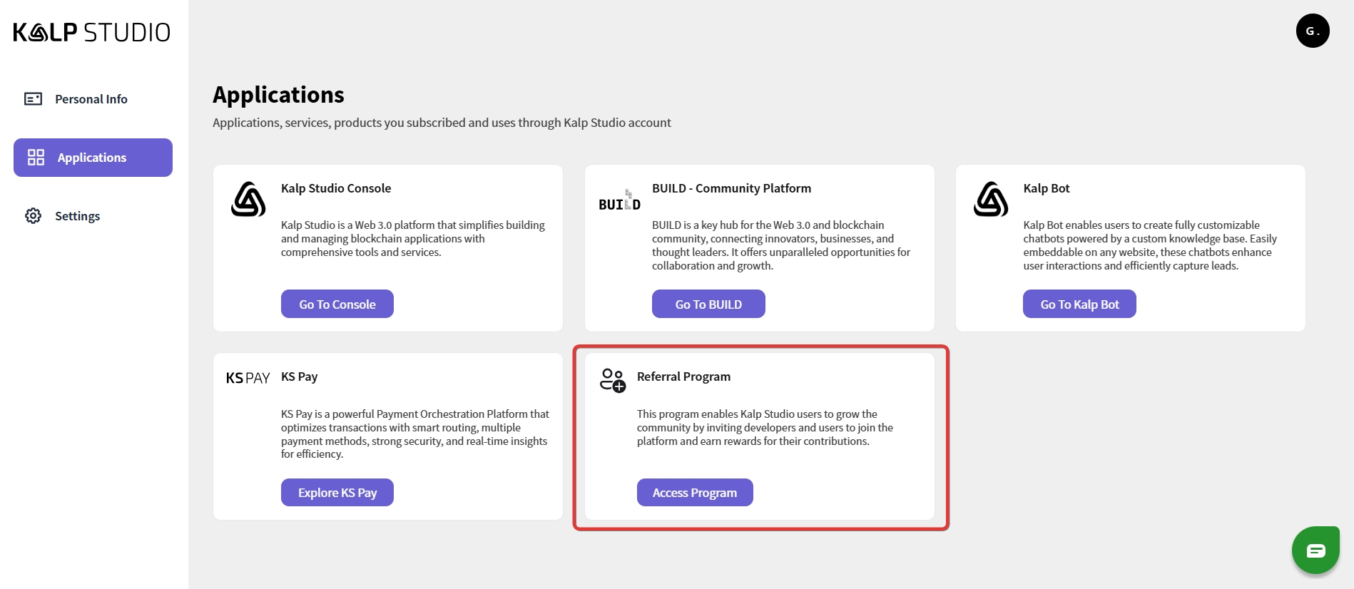 1. Locate the "Referral Program" Card: Scroll through the Applications section to find the card labeled "Referral Program."