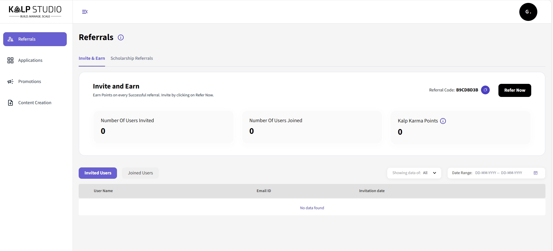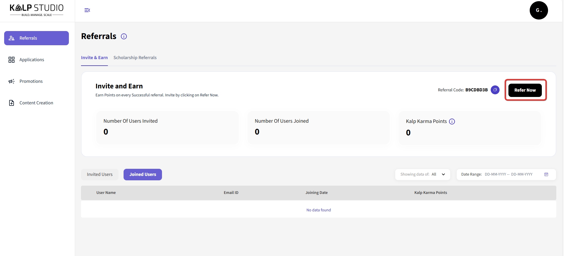 • Number Of Users Joined: This shows the number of users who have successfully joined Kalp Studio using your unique referral link or code.