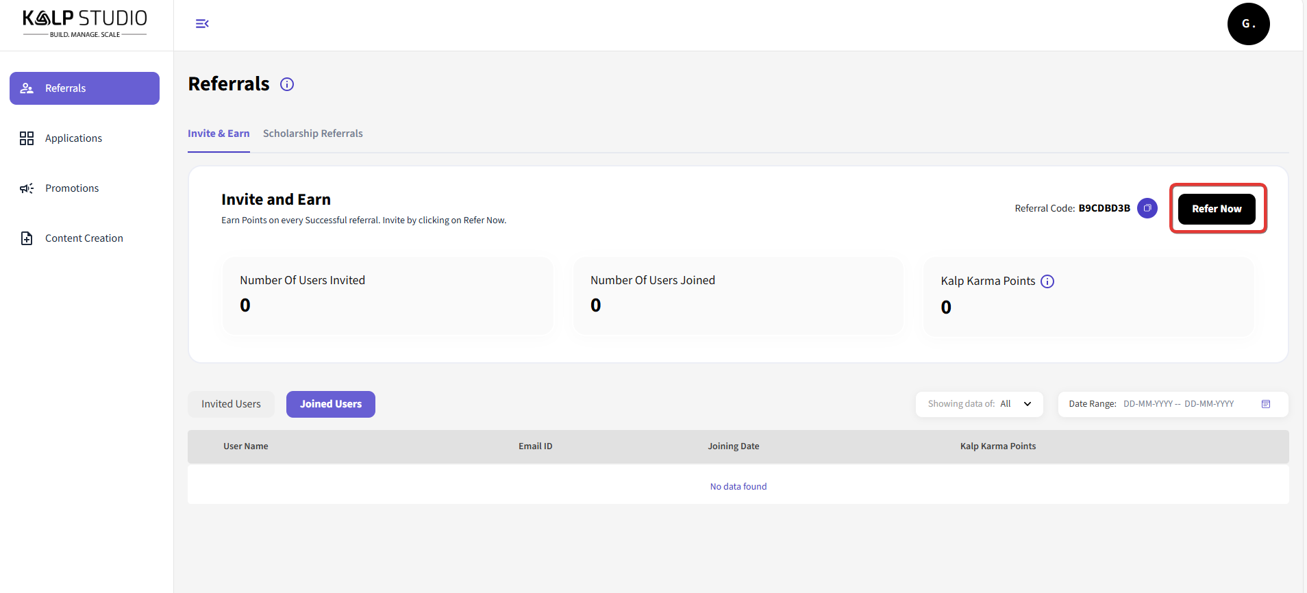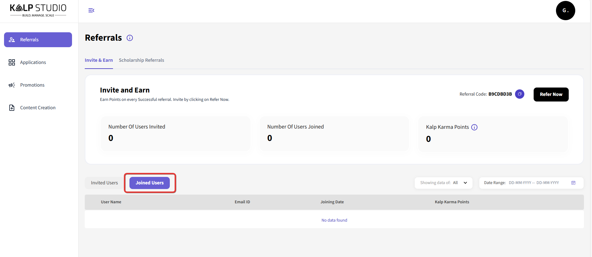 Number Of Users Joined: This shows the number of users who have successfully joined Kalp Studio using your unique referral link or code.