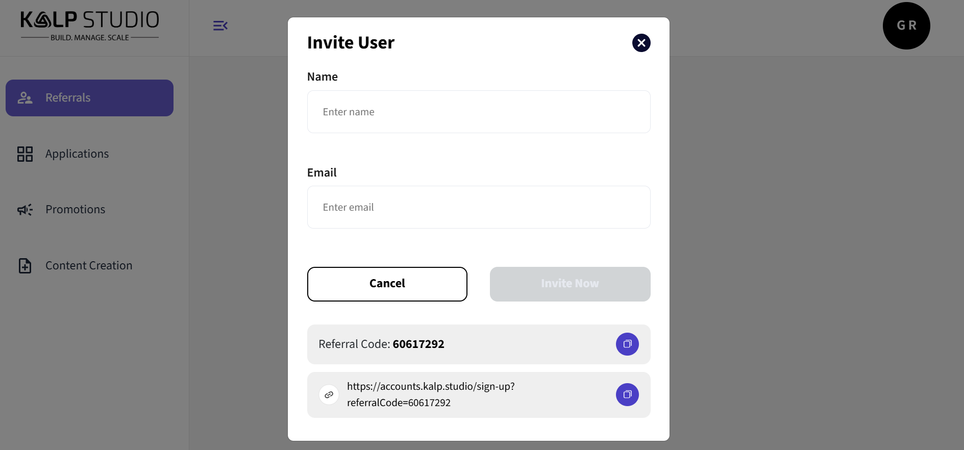 Click the "Refer Now" button. This will open a pop-up window titled "Invite User".