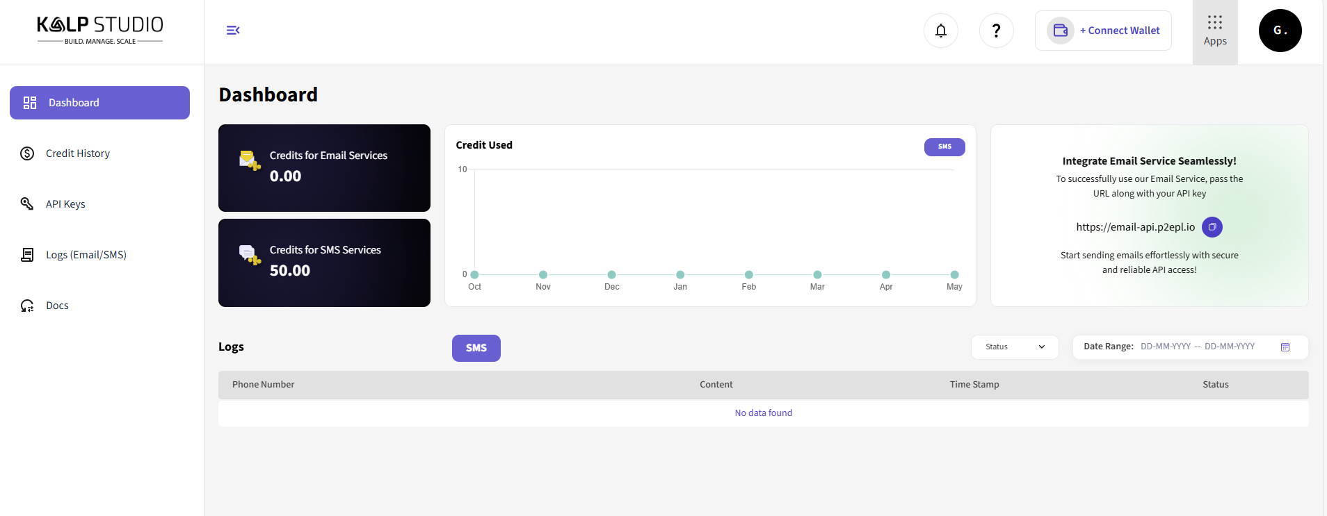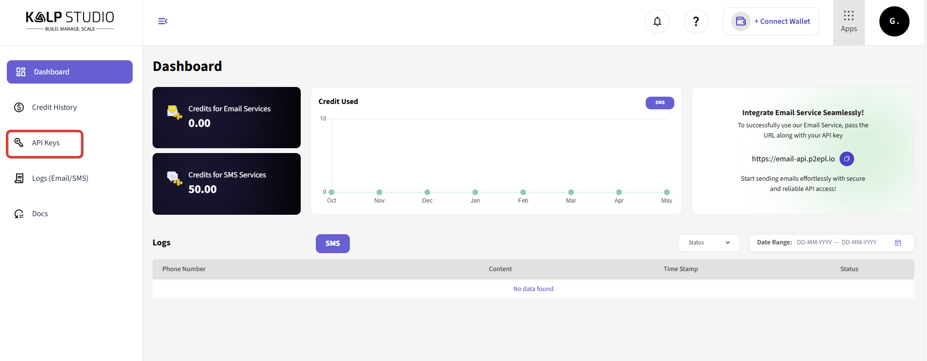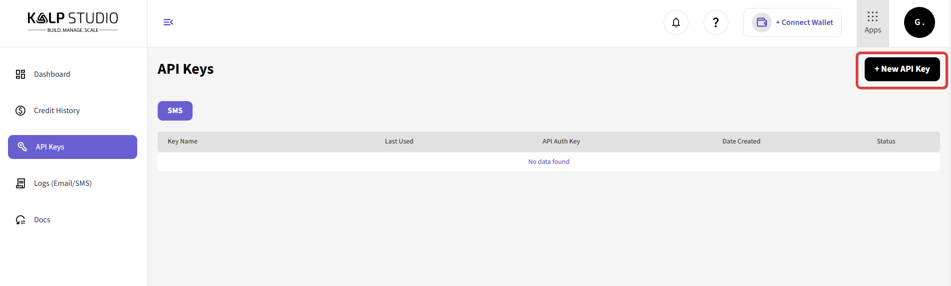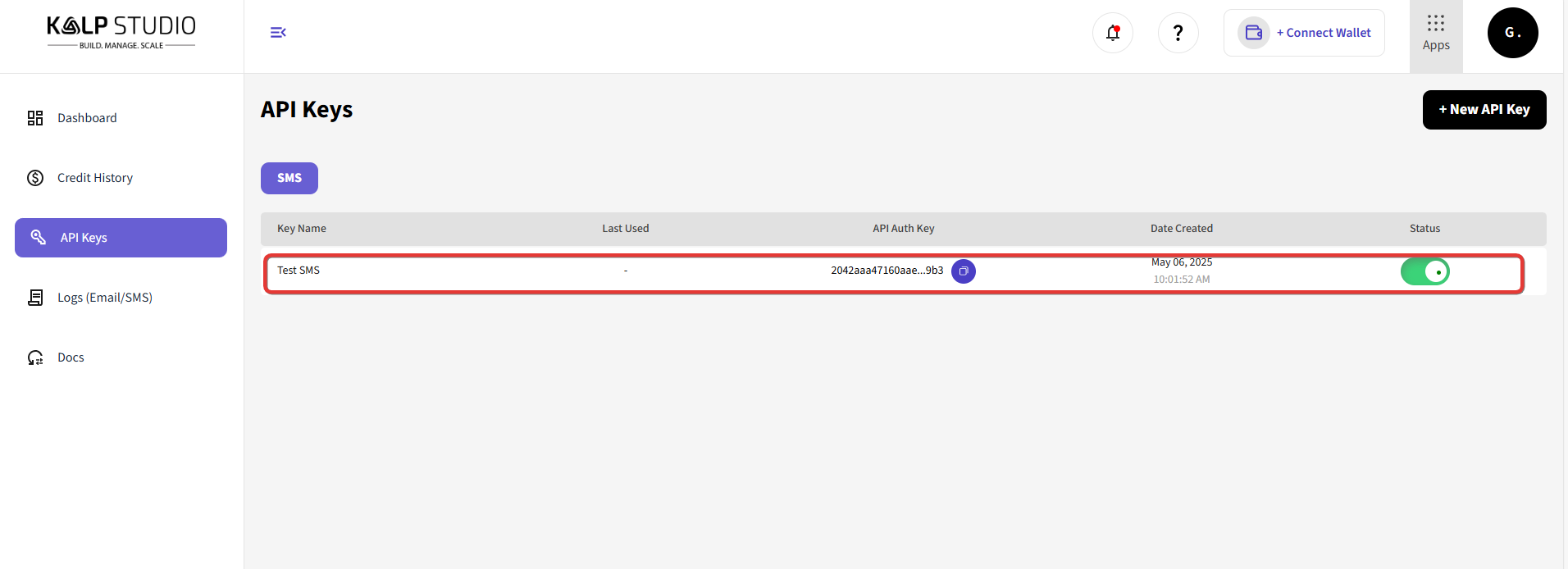 This guide will walk you through the straightforward process of generating a new API Key specifically for the SMS service within the Kalp Studio platform, using visual steps based on the platform's interface.