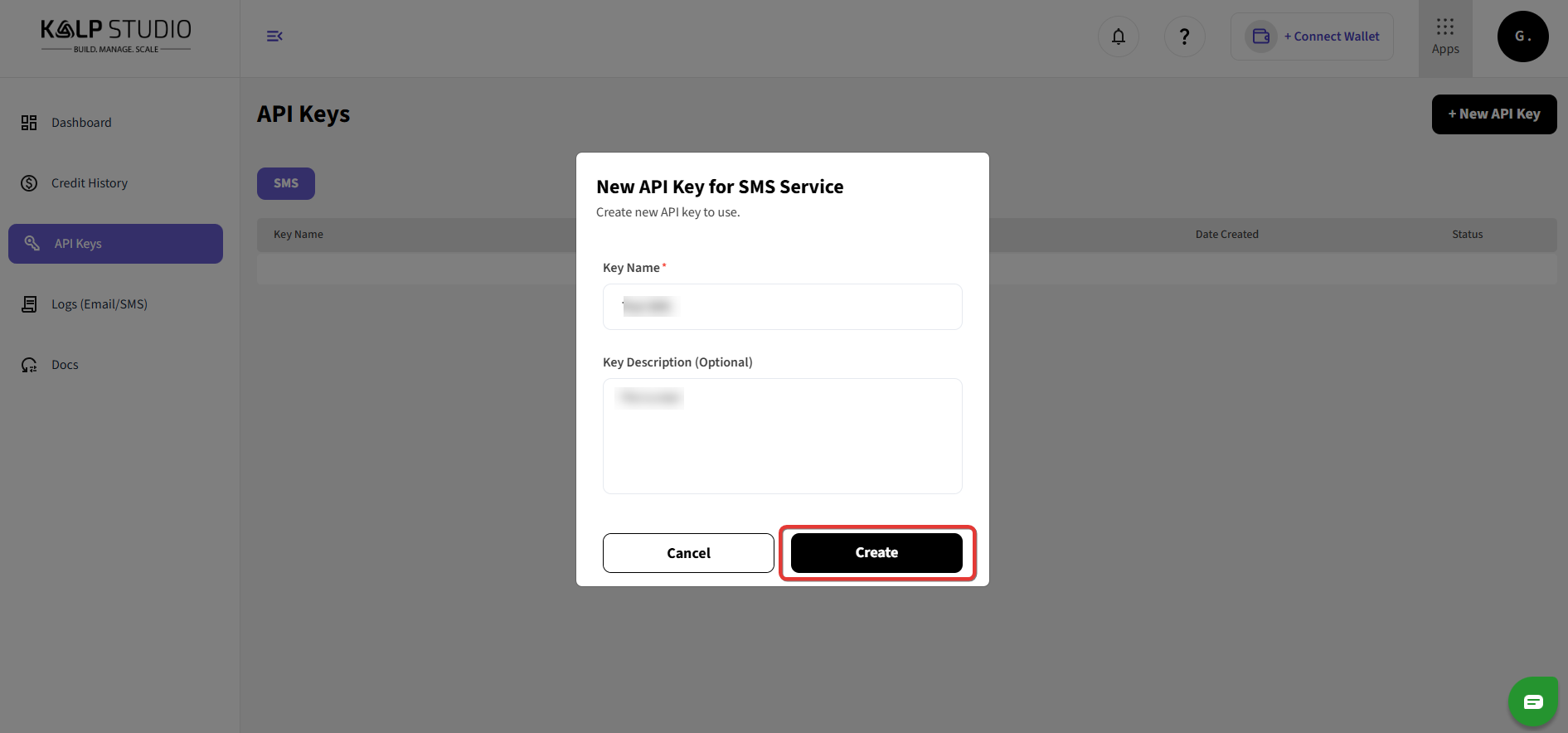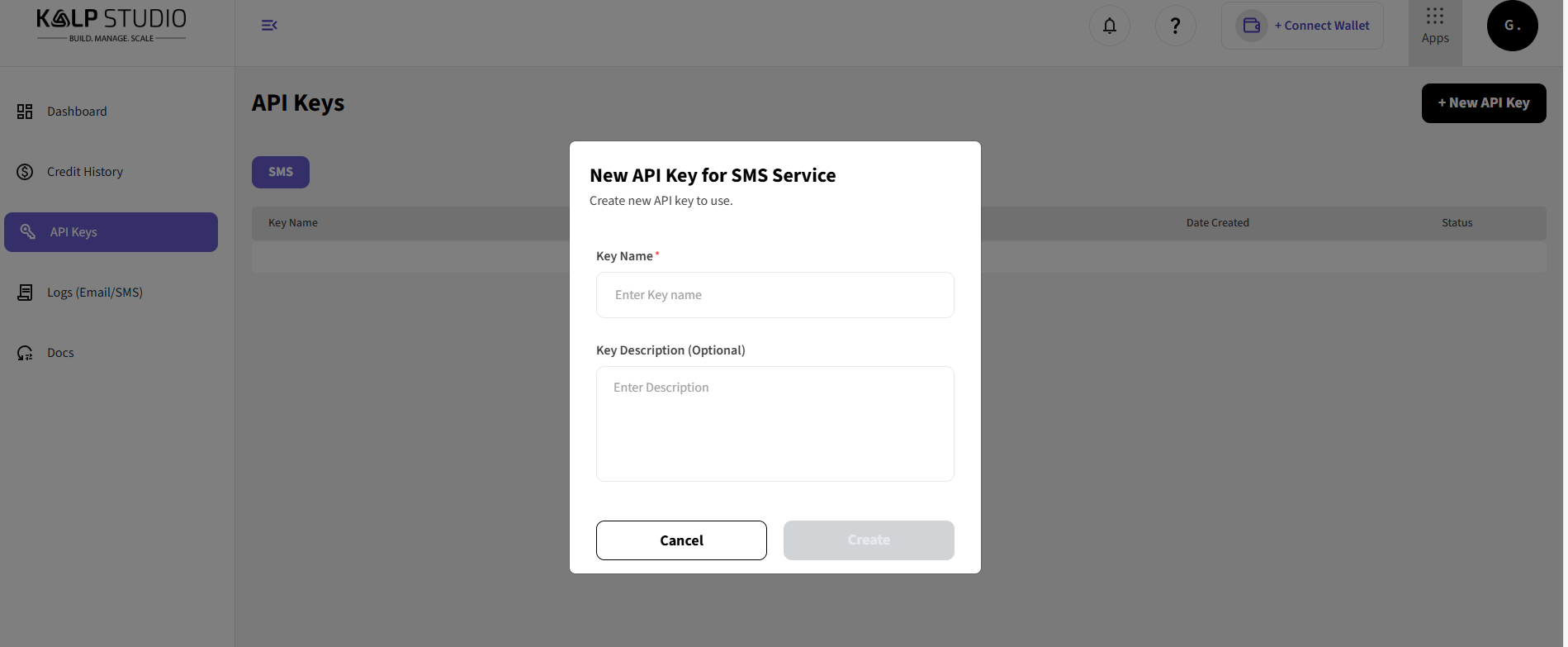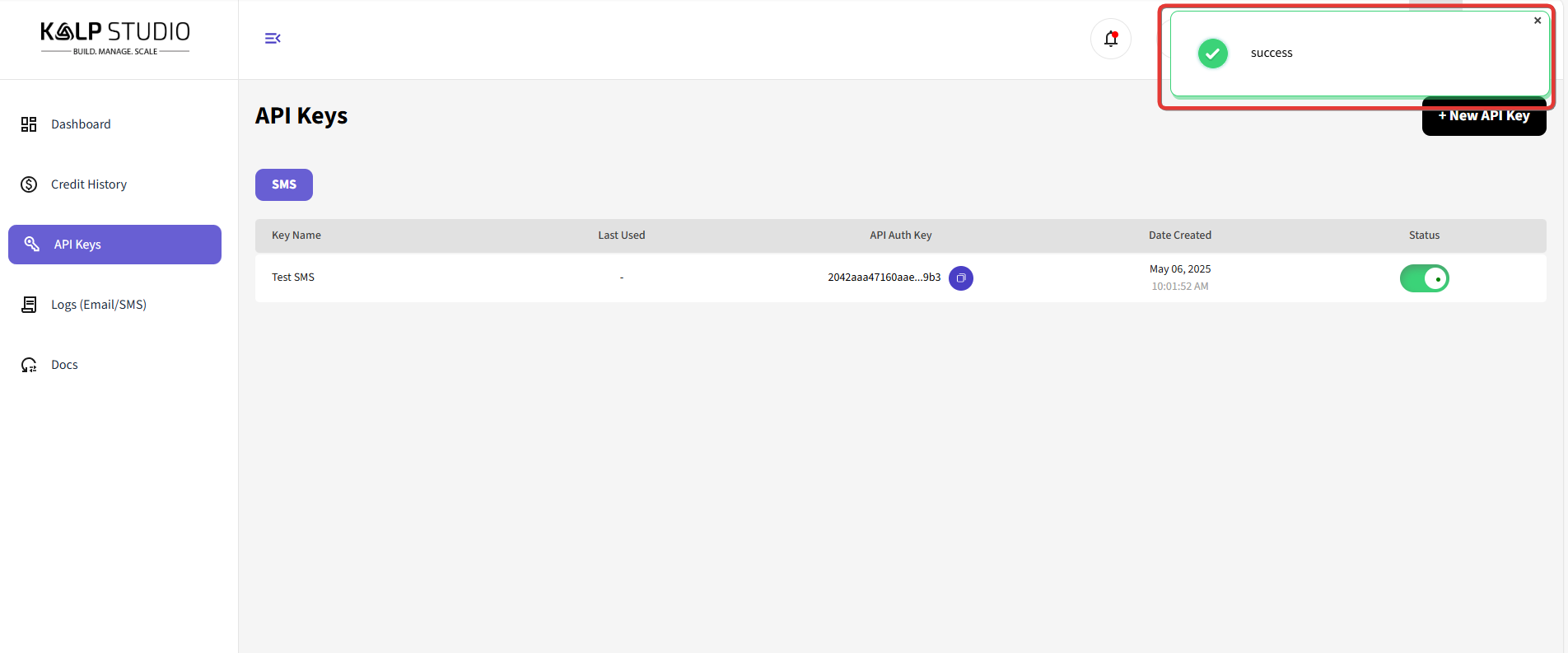 Generating an API key for the Kalp Studio SMS service is a simple process involving navigating to the API Keys section, initiating creation, providing a name, and confirming. This key is crucial for authenticating your requests when integrating the SMS service into your applications or workflows. Always remember to keep your API keys confidential and manage their status actively to ensure the security and integrity of your account and services. With your new key generated, you are ready to start sending SMS messages via API.