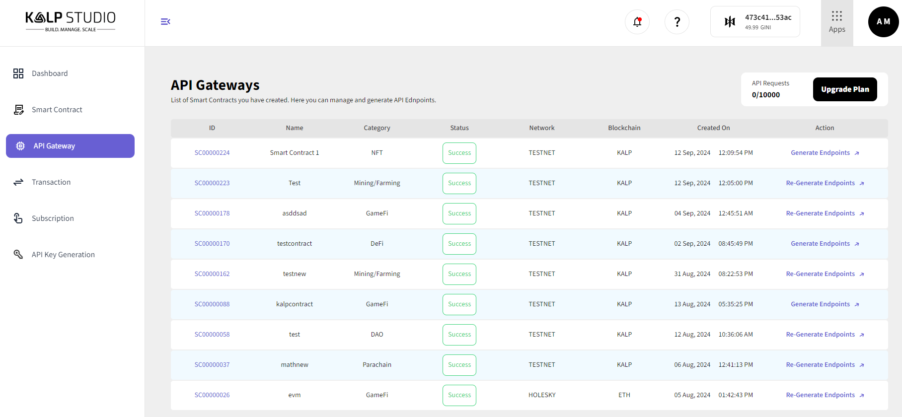 The API Gateway page will display a list of smart contracts you have created. This list includes details such as: