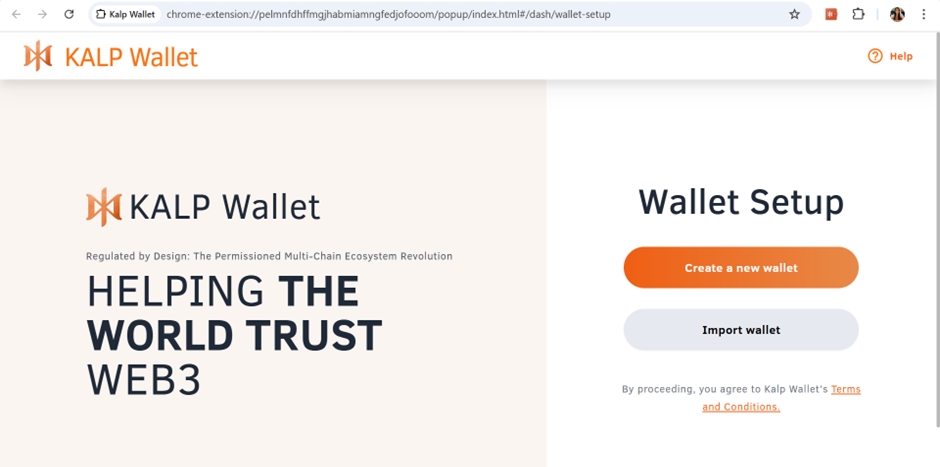 Open the Extension: Click on the Kalp Wallet icon, which opens the welcome screen with options to either create a new wallet or import an existing one.