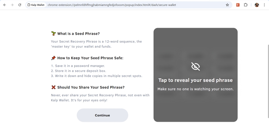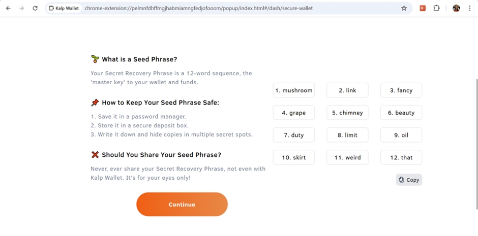 Backup Seed Phrase: After setting a password, Kalp Wallet displays a 12-word seed phrase. Carefully write down the seed phrase on paper and store it in a secure location, understanding its importance for wallet recovery.