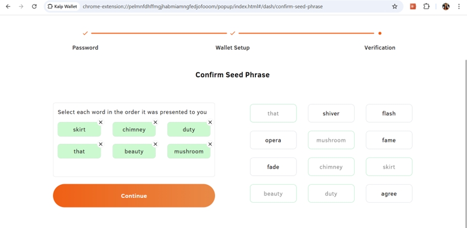 Verify the Seed Phrase: To complete the process, verify the seed phrase by selecting the words in the correct order. This step ensures you have backed it up correctly.
