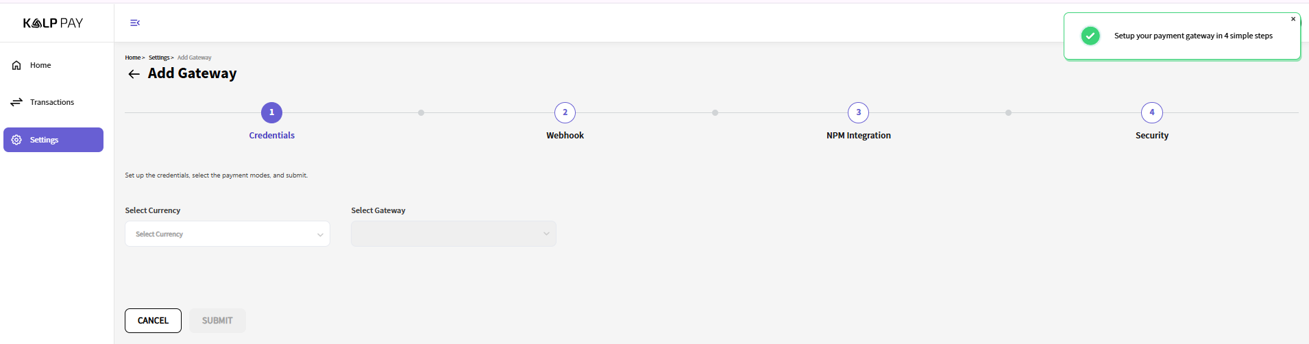 You will be directed to the first step - "Credentials". This is where you'll need to configure your gateway settings.