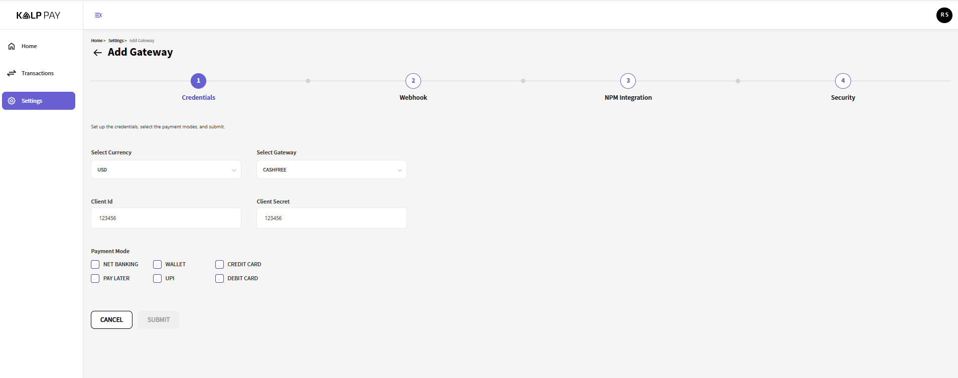 Payment Modes: Select the desired payment methods (e.g., Net Banking, Wallet, UPI, Card) your users will use with this gateway.