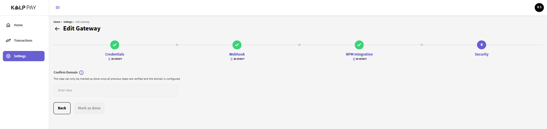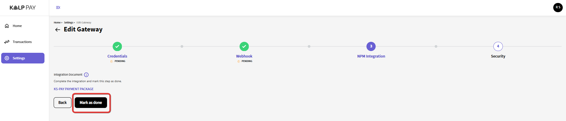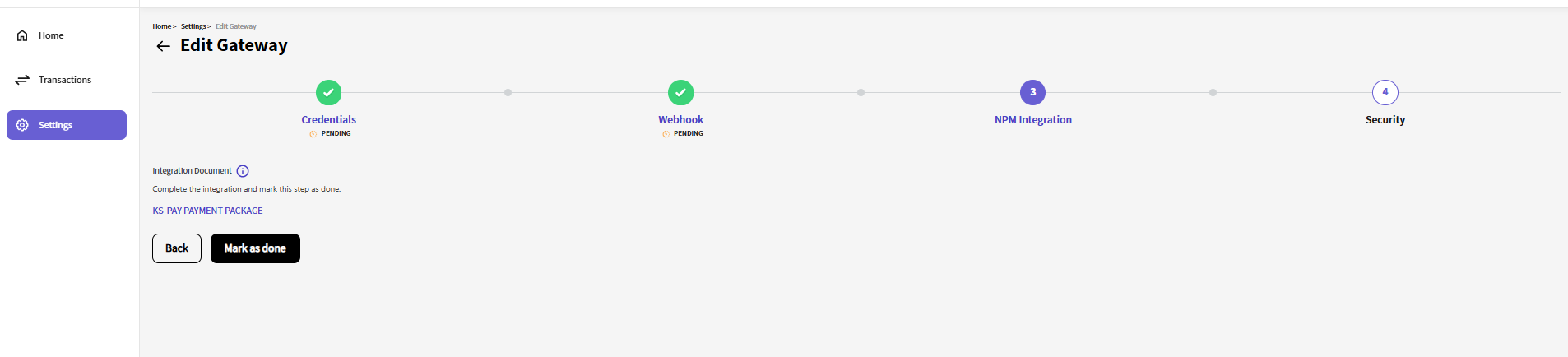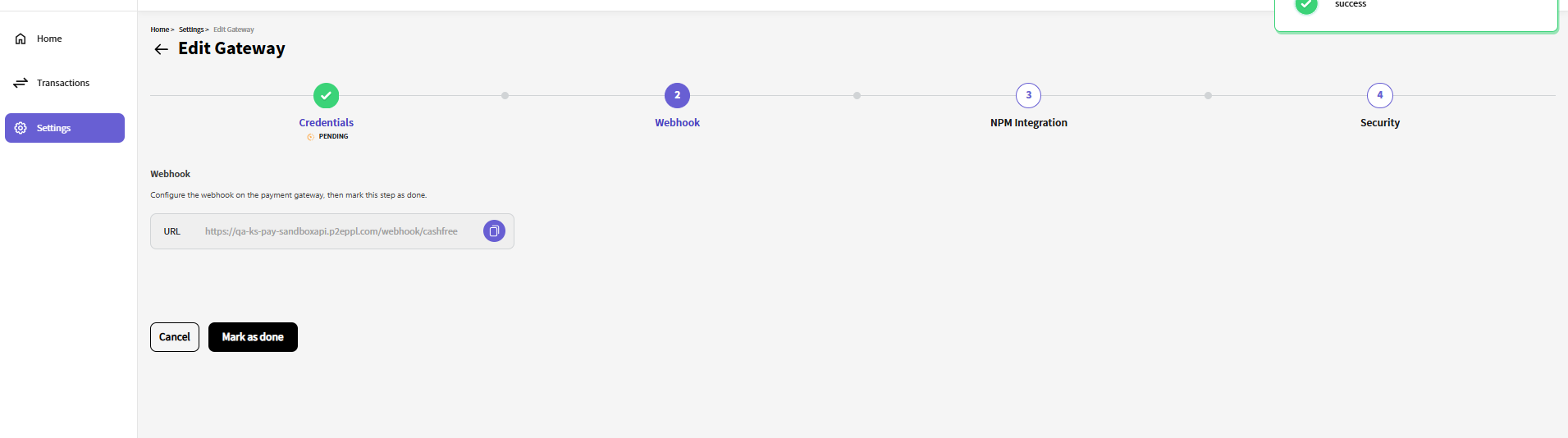 Once you have configured the webhook on the payment gateway side, click the "Mark as done" button to move on to the next step.