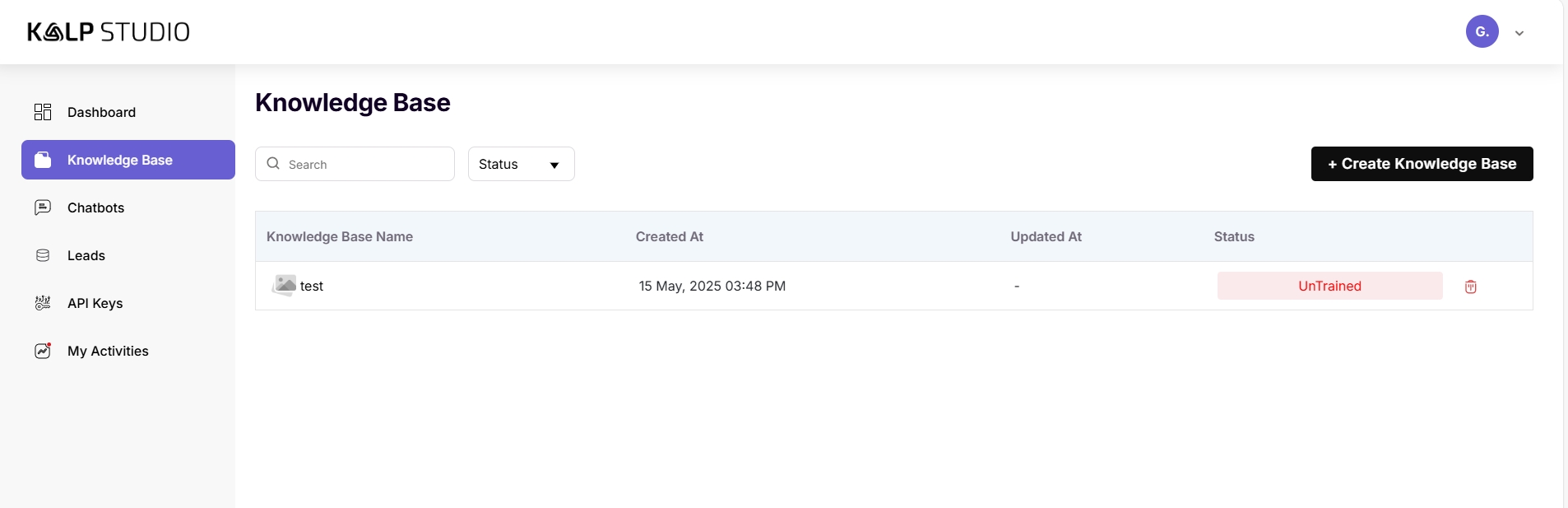 Here, you'll see your newly created knowledge base (e.g., "test") listed along with details like: