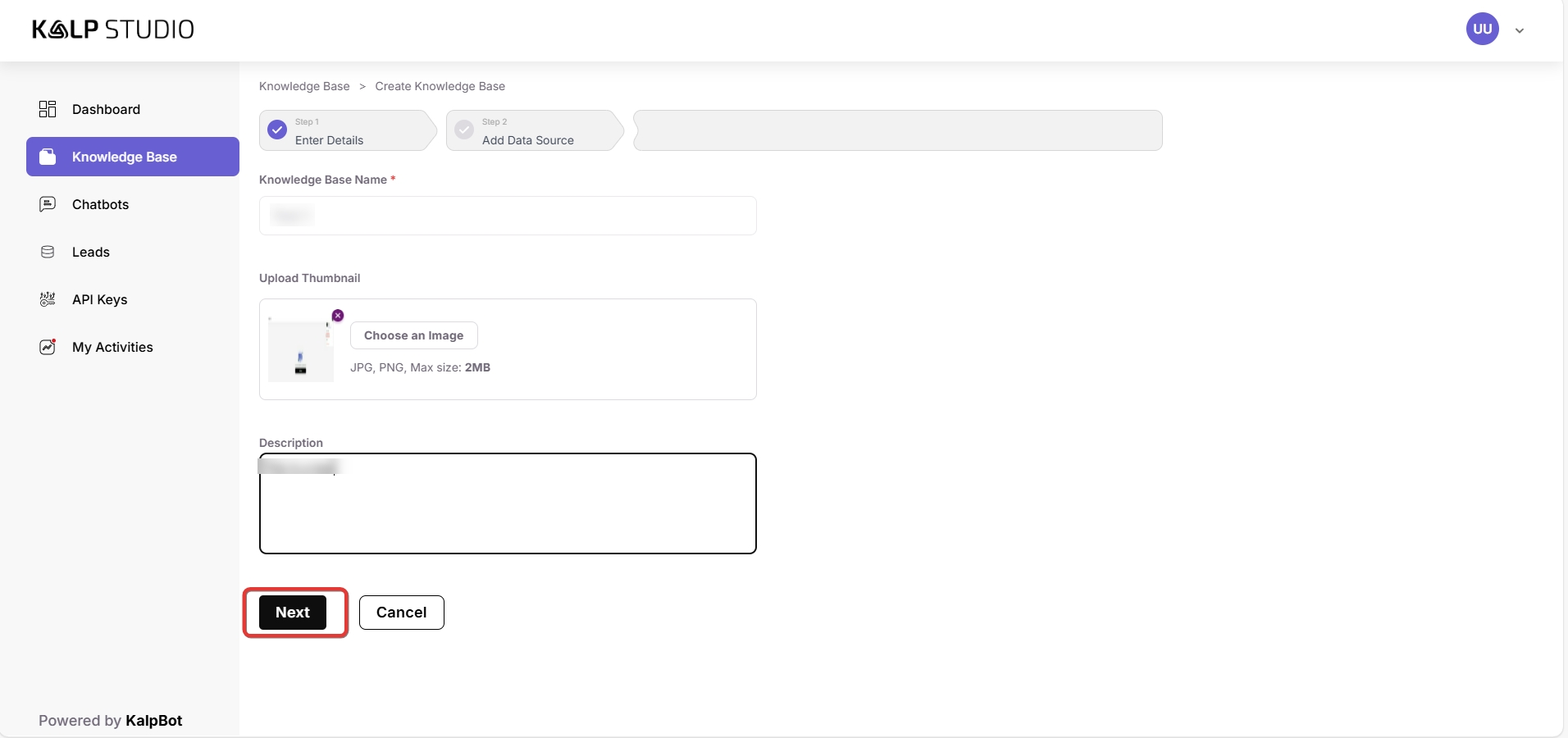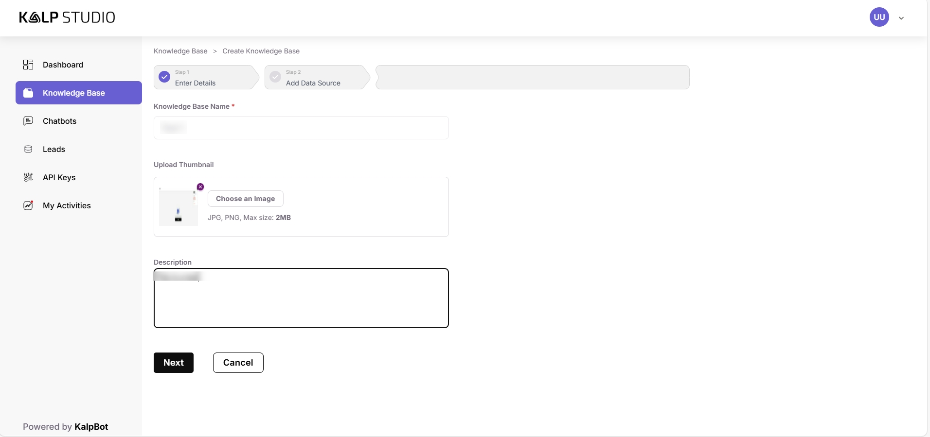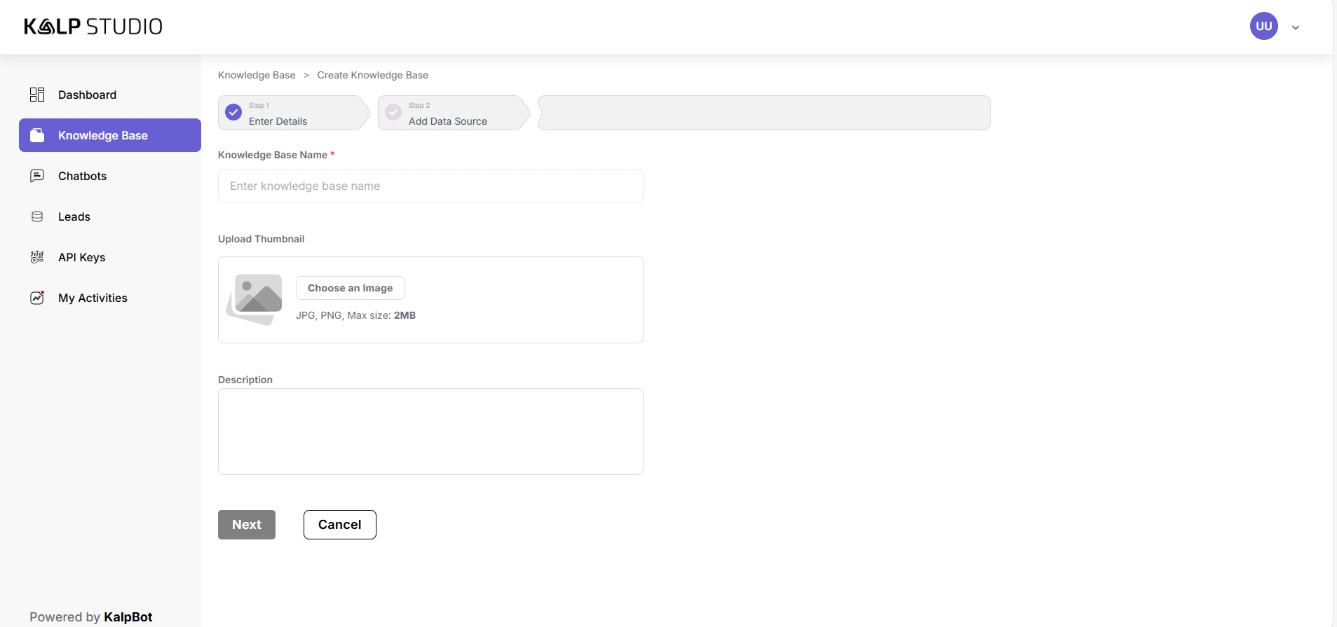 Upload Thumbnail: You can upload an image (JPG, PNG; Max size: 2MB) to serve as a thumbnail for your knowledge base. This is optional but can help in visually organizing multiple knowledge bases.
