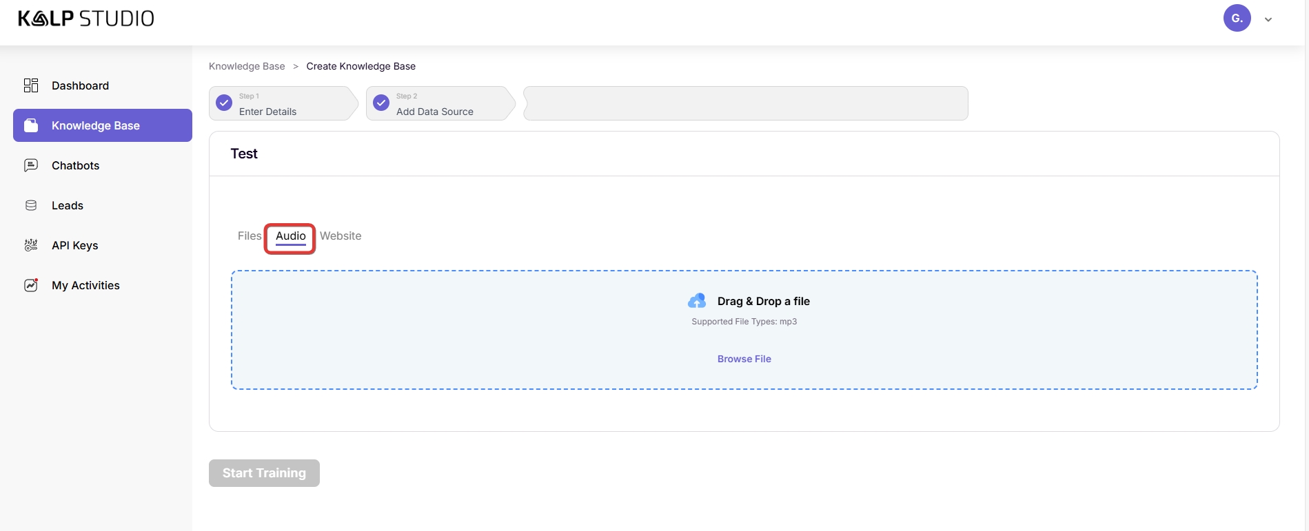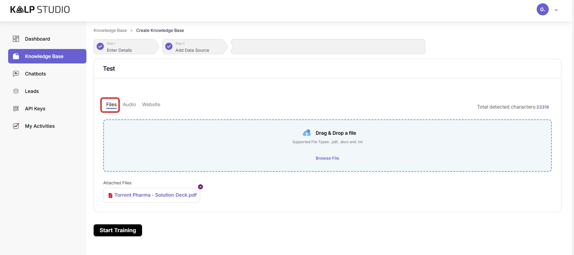 A knowledge base is the brain of your chatbot. It's where you feed it the information specific to your business, products, services, or any domain you want it to be an expert in. Without a well-structured and comprehensive knowledge base, your bot will be limited in its ability to assist users effectively. Kalp Studio simplifies the creation process, allowing you to use various data sources like files, audio, and website content.