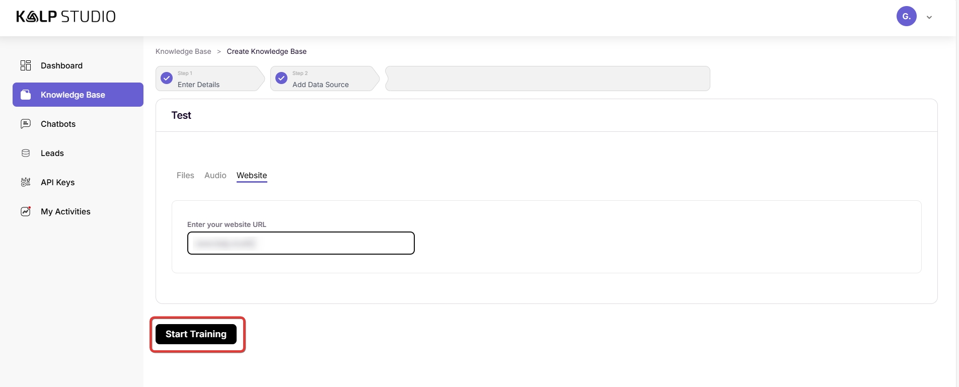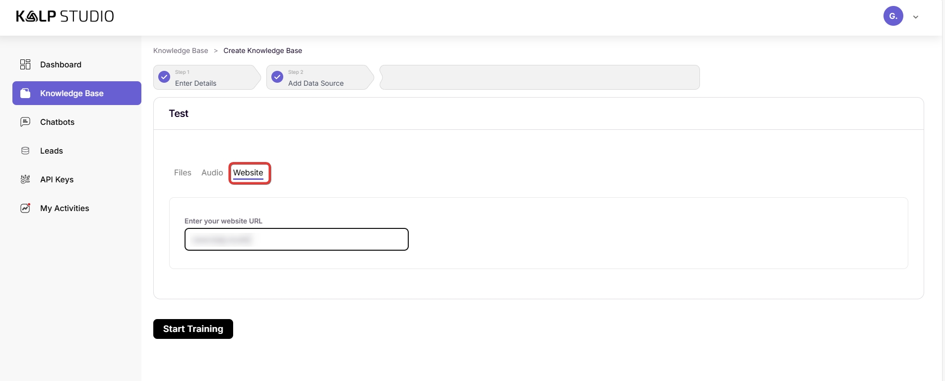 In the "Enter your website URL" field, paste the URL of the website or specific web pages you want Kalp Bot to learn from. The system will then crawl and extract information from this source.