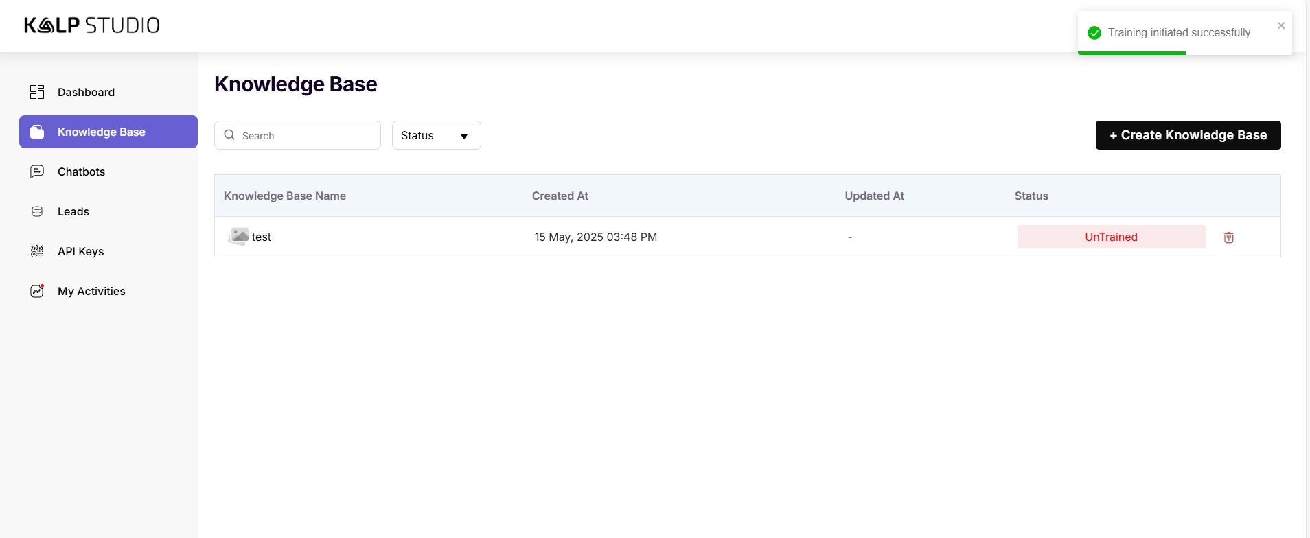 Creating a knowledge base in Kalp Studio is a straightforward process designed to be user-friendly. By carefully curating and uploading relevant information through files, audio, or website links, you empower your Kalp Bot to understand user queries better and deliver more accurate and helpful responses.