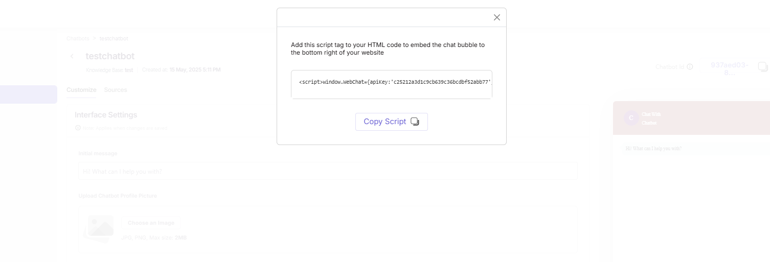 • This modal will display a snippet of HTML code. This code is a <script> tag specifically generated for your chatbot.