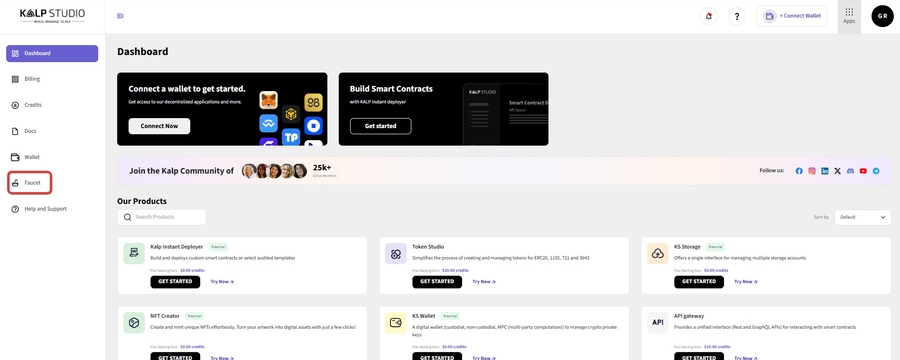 Once you’ve logged in, look at the left-hand menu of your dashboard (as shown in the screenshot below). You will see several options, including Dashboard, Billing, Credits, Docs, Wallet, and Faucet. Click on Faucet to proceed to the faucet page.
