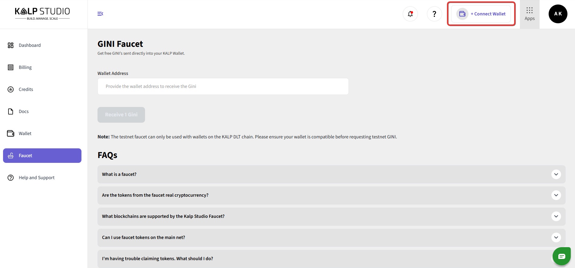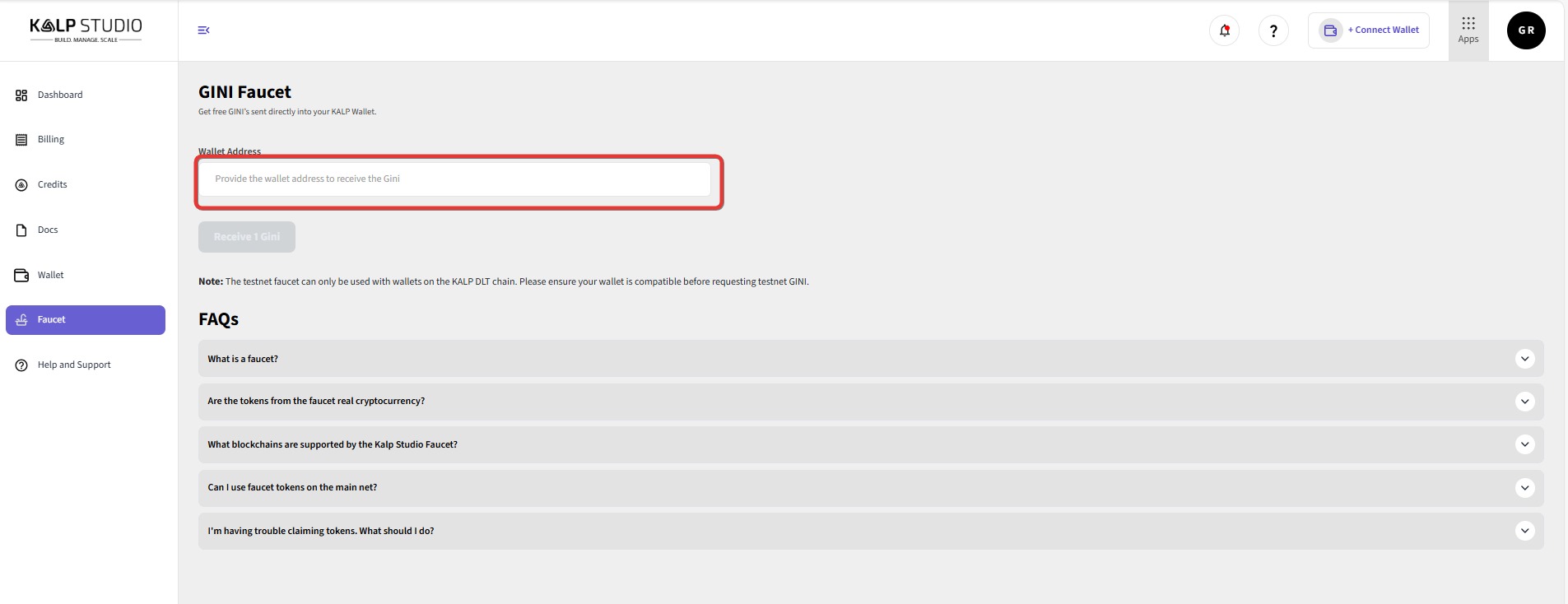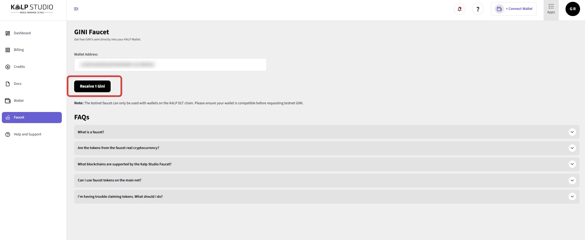 Follow these simple steps to receive 1 free Gini token in your Kalp wallet using the Kalp Studio faucet.