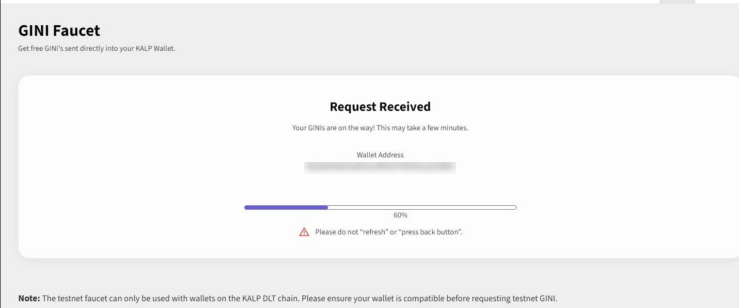 After clicking the Receive 1 Gini button, you will see a confirmation message stating that your request is being processed (as shown in the screenshot below).