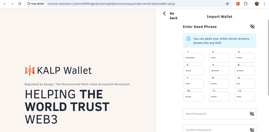 Importing your Kalp Wallet into the Kalp Wallet Extension is a simple process. Follow the steps below to securely access your existing wallet: