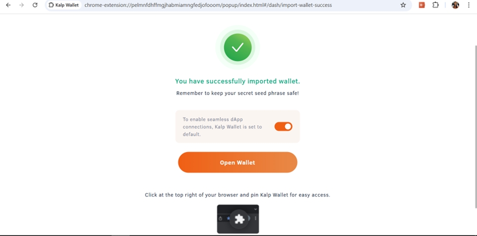 Congratulations! You've successfully imported your Kalp Wallet and can now manage your digital assets securely on the Kalp blockchain.