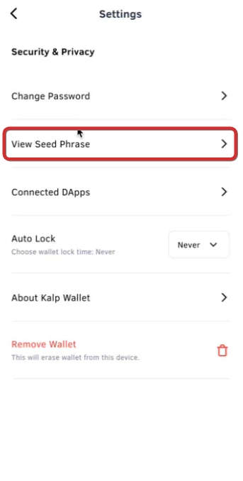 Within the Settings menu, find and select the option labelled "View Seed Phrase."