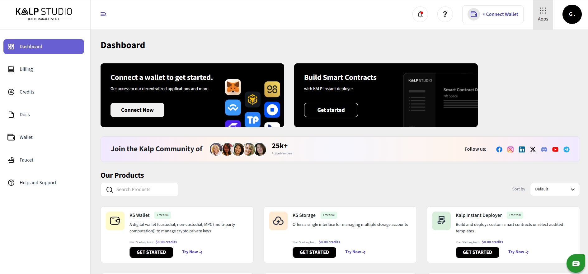 Product Page: After Successfully Sign-In you will find a product page. In this page you will see different applications like SMS, Kalp Instant Deployer, Email, KS Storage, KS Wallet, KS Query, NFT Creator, Token Studio, API Gateway.
