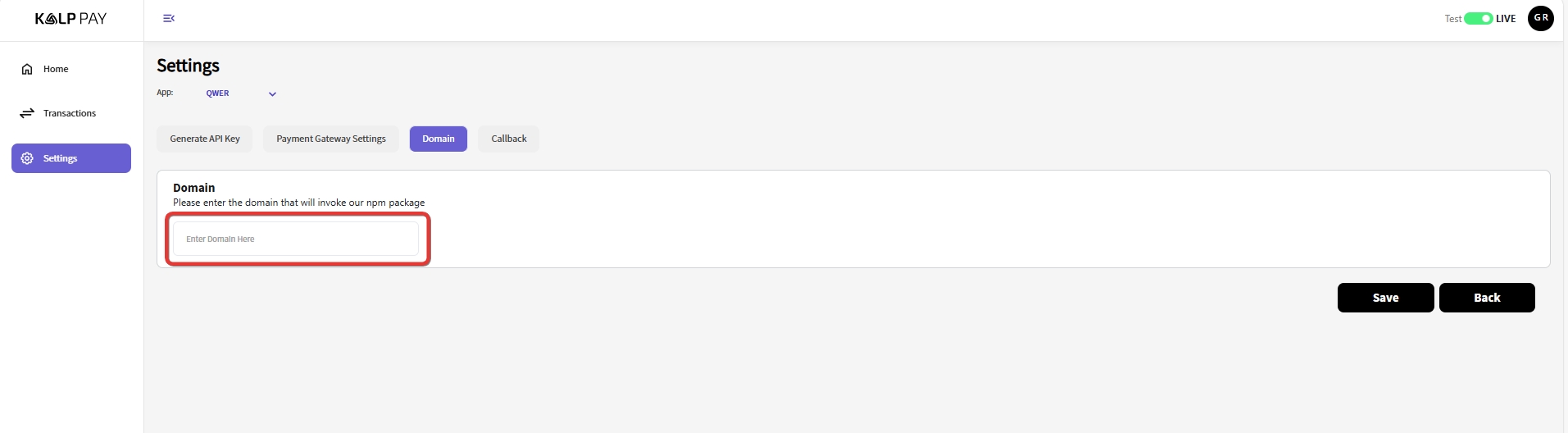 After entering your domain, confirm your changes. Ensure that the domain is correctly saved and displayed in the settings. This domain will now be associated with your app on KS Pay.