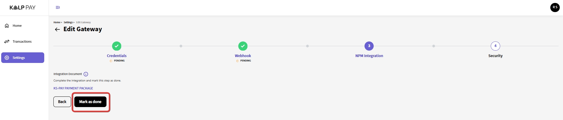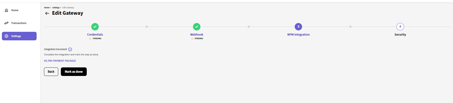 To complete this step, you'll need to integrate the provided SDK into your application. You can find more information on the Integration document (in our example, "KS-PAY PAYMENT PACKAGE") by clicking on it. This document contains instructions and the code to install and utilize the package, and also links to the NPM page to further understand the package information.
