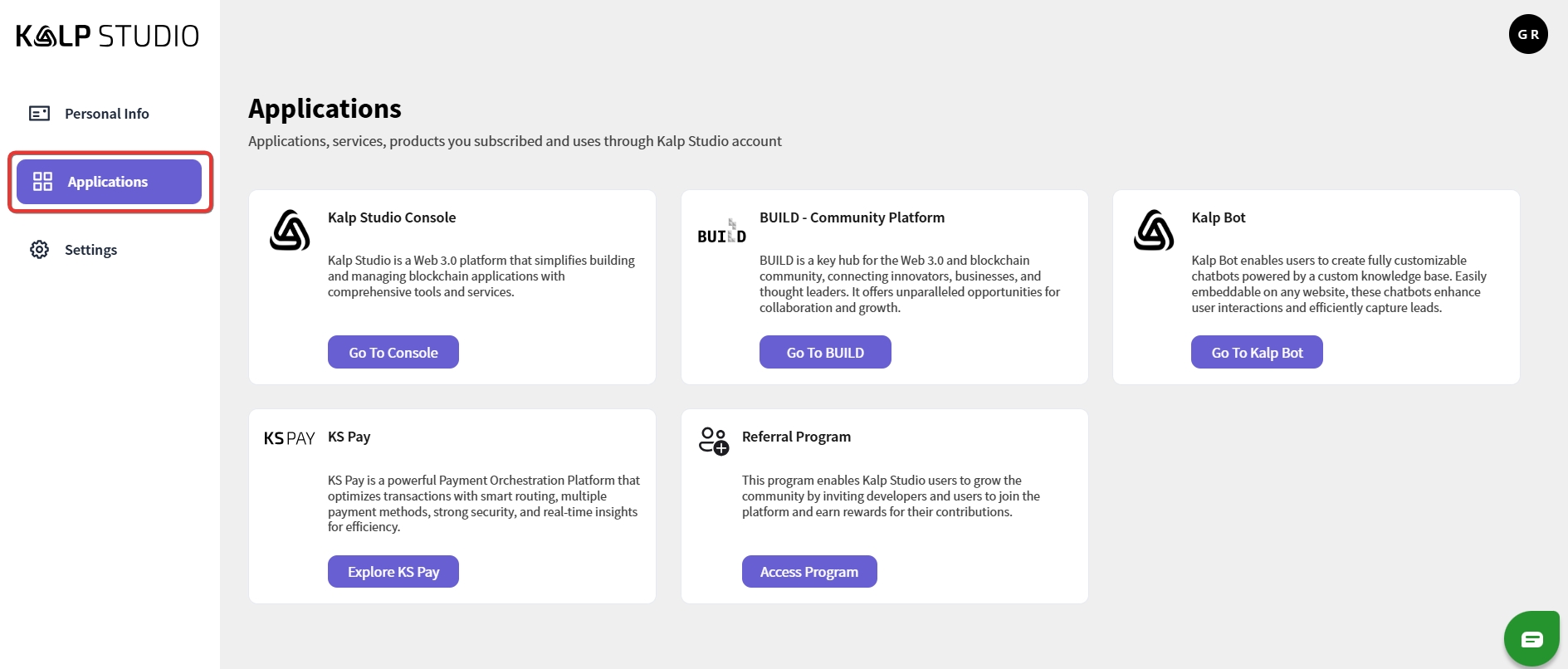 On the left-hand side of the screen, you'll find a navigation menu. This menu contains various options, including "Personal Info," "Applications," and "Settings”, as shown in the screenshot below.