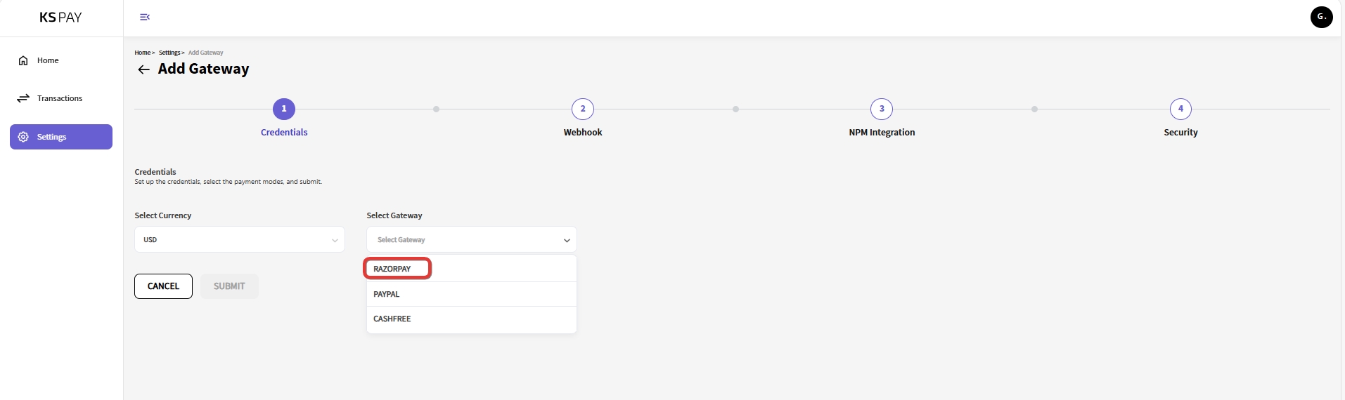 After successfully configuring the webhook within your payment gateway and verifying that it's working, return to the KS Pay interface.