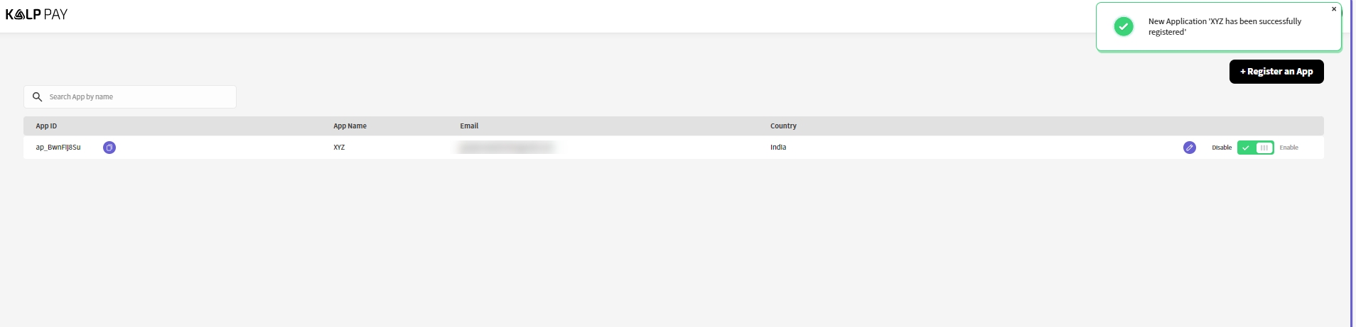 A confirmation message will appear on your dashboard indicating that your app has been successfully registered, as shown in the screenshot below.